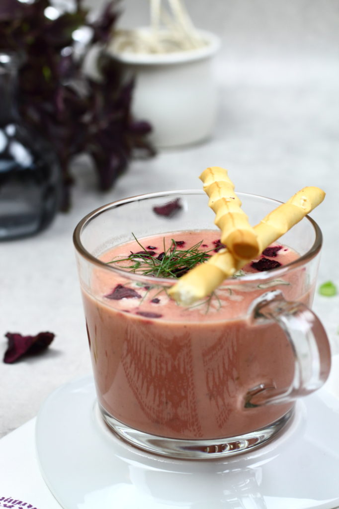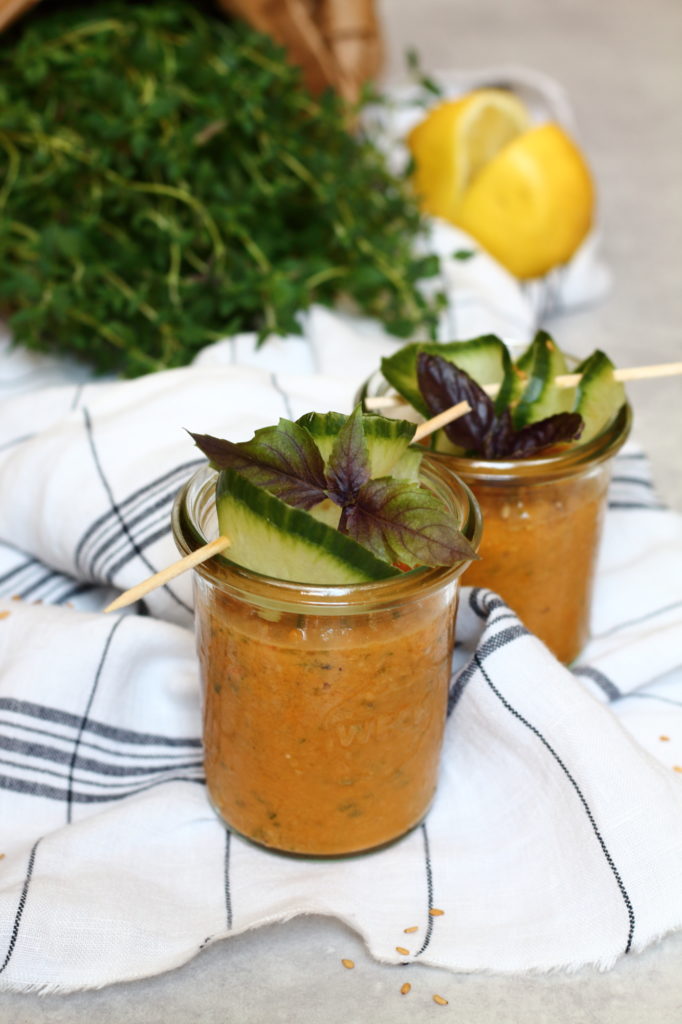 Hast du eine schöne Grillerei am langen Wochenende geplant? Ja? Und wie ist das bei dir/euch so? Bei uns gibt es eigentlich keine Vorspeise vor dem Grillen. Eigentlich schade, denn ich liebe Vorspeisen, Suppen & Co. Um diese Lücke ausfüllen zu können und passend für das schöne Sommerwetter, habe ich heute eine kalte Gemüsesuppe in petto. Dabei muss ich fast schmunzeln, denn wie ich alles geschnippelt habe, habe ich mich gefragt, was denn eigentlich der Unterschied zwischen einem gemüselastigen Smoothie und einer kalten Gemüsesuppe ist. Tja, keine Ahnung, vielleicht weißt du es ja. 😉 Zutaten für 2 Personen: 150 g Tomaten (ohne Strunk, ohne Kerne) 150 g Paprika (ohne Strunk, ohne Kerne) 200 g Gurke (nicht geschält, ohne Kerne) 10 g Frühlingszwiebel 1 Knoblauchzehe 2 EL Semmelbrösel 1 EL Zitronensaft 1 EL Öl (z.B. Rapsöl) 10 g Basilikumblätter 1 TL gehackte Liebstöckelblätter Salz und Pfeffer Zubereitung (ca. 15 Minuten + 30…