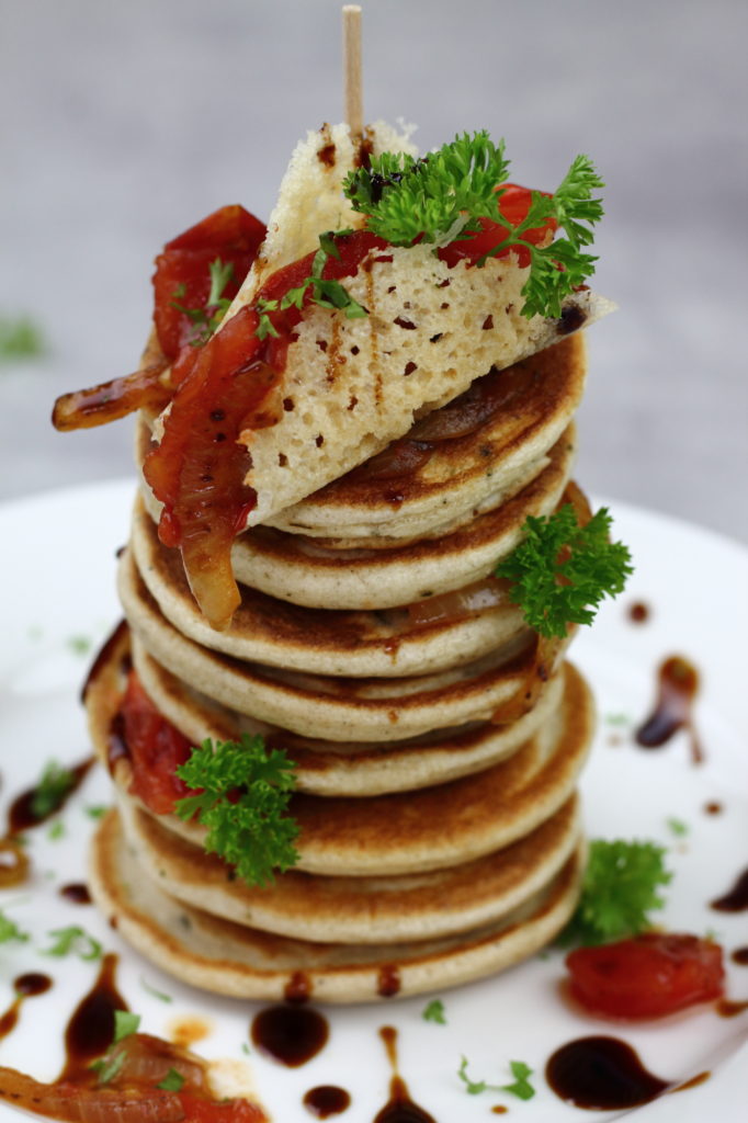 Kräuterpancakes mit Zwiebel- Tomatentopping und Parmesanhippe