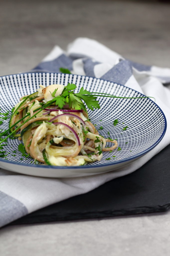 Ich habe meinen Blog letzte Woche wirklich stiefmütterlich behandelt. Eigentlich hatte ich das nicht vor (wer macht das auch schon absichtlich?), aber mein Zeitmanagement hat etwas versagt. Ich bin ehrlich, ich habe die letzte Seminararbeit für’s 4. Semester unterschätzt und habe gefühlte 10000 Jahre gebraucht, um diese fertigzustellen. ABER – nun ist sie fertig, hochgeladen, das 4. Semester ist somit vorbei und das wird mit leckeren Aufstrich- Nudeln gefeiert. 😀 Das Rezept ist wirklich simpel und schmeckt einfach köstlich. Zutaten für 2 Personen: 140 g Dinkel- Vollkornnudeln ½ Zucchini 1 Zwiebel 150 g Frischkäse natur 2 EL gehackte Petersilie 150 g geräuchertes Bachsaiblingfilet etwas Öl Salz und Pfeffer etwas Nudelwasser Zubereitung: Die Zucchini waschen und mit einem Gemüsespiralschneider in Gemüsespaghetti verwandeln. Anschließend beiseitesetellen. Die Zwiebel würfeln und in etwas Öl in einer beschichteten Pfanne glasig anbraten. Anschließend den Frischkäse hinzugeben und diesen schmelzen lassen. Den Bachsaibling in kleine bis mittlere…