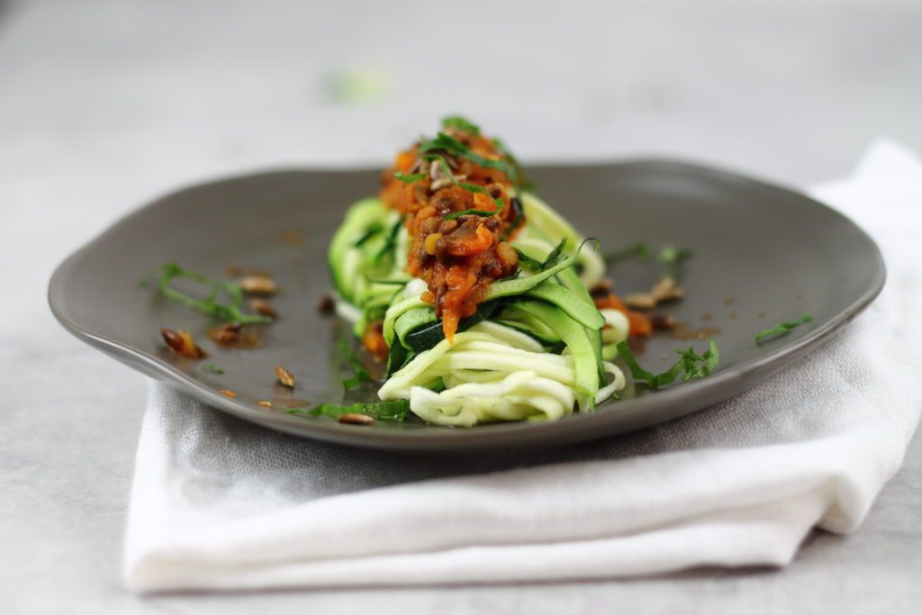 Sommerlicher kann ein Gericht kaum sein (meiner Meinung nach). Köstliche Linsen in einer feinen Tomatensauce gegart und dazu knackige Zucchininudeln (Zoodles). Noch dazu ist das Ganze vegan – wer das nicht möchte, der/die kann sich ja zum Schluss noch eine größere Menge geriebenen Hartkäse oder Mozzarella drauf geben. Was ich an diesem Gericht am liebsten mag, sind die Zoodles. Die gehen so schön schnell, sind leicht bekömmlich und zaubern Farbe aufs Teller. 🙂 Zutaten für 2 Portionen: 1 große Zucchini 60 g rote Linsen 1 große Fleischtomate 2 EL Tomatenmark 1 große Karotte ½ Zwiebel 50 g Sonnenblumenkerne optional: 2 Blätter vom Stangensellerie etwas Knoblauch etwas Öl Salz & Pfeffer Zubereitung: Die Zwiebel fein würfelig schneiden. Die Karotte anschließend grob raspeln. Die Linsen unter fließendem Wasser gut waschen. Die Fleischtomate in mittelgroße Würfel schneiden. Den Knoblauch fein hacken. Das Öl in einem Topf erhitzen und die Zwiebelwürfel, sowie die Linsen, den…