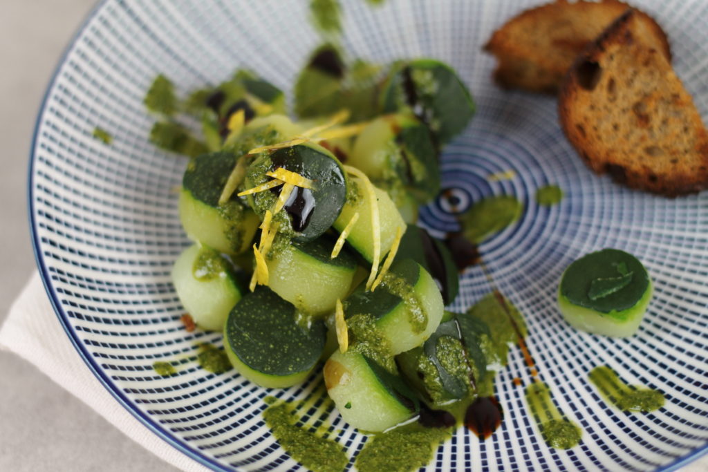 Die Zucchini ist ein richtiger Alleskönner in der Küche. Egal ob süß oder pikant – ich mag sie. Heute gibt es quasi einen leckeren und sommerlichen Zucchinibällchensalat. Ich finde ja sowieso, dass Gemüse, welches mit dem Perlausstecher ausgestochen wurde, gleich appetitlicher aussieht. Und wenn dann noch Pesto im Spiel ist, ja dann bin ich definitiv hin und weg. 😀 Zutaten für 2 Personen (als Vorspeise): 1 mittelgroße Zucchini 3 Scheiben dunkles Brot etwas Öl etwas Knoblauch Abrieb einer Zitrone Für das Pesto: 80 g Öl (z.B. Olivenöl, Rapsöl, etc.) 40 g Basilikumblätter 30 g Sonnenblumenkerne 15 g Parmesan Salz und Pfeffer etwas Zitronensaft Zubereitung: Den Backofen auf 180°C Umluft vorheizen. Mit einem Perlausstecher Kügelchen aus der gewaschenen Zucchini ausstechen. Eventuell die Zucchini zuvor schälen, wenn die Schale bitter schmeckt. Die Kügelchen anschließend in Salzwasser bissfest kochen und mit kaltem Wasser abschrecken. In der Zwischenzeit wird das Pesto zubereitet. Hierfür die Basilikumblätter mit dem…