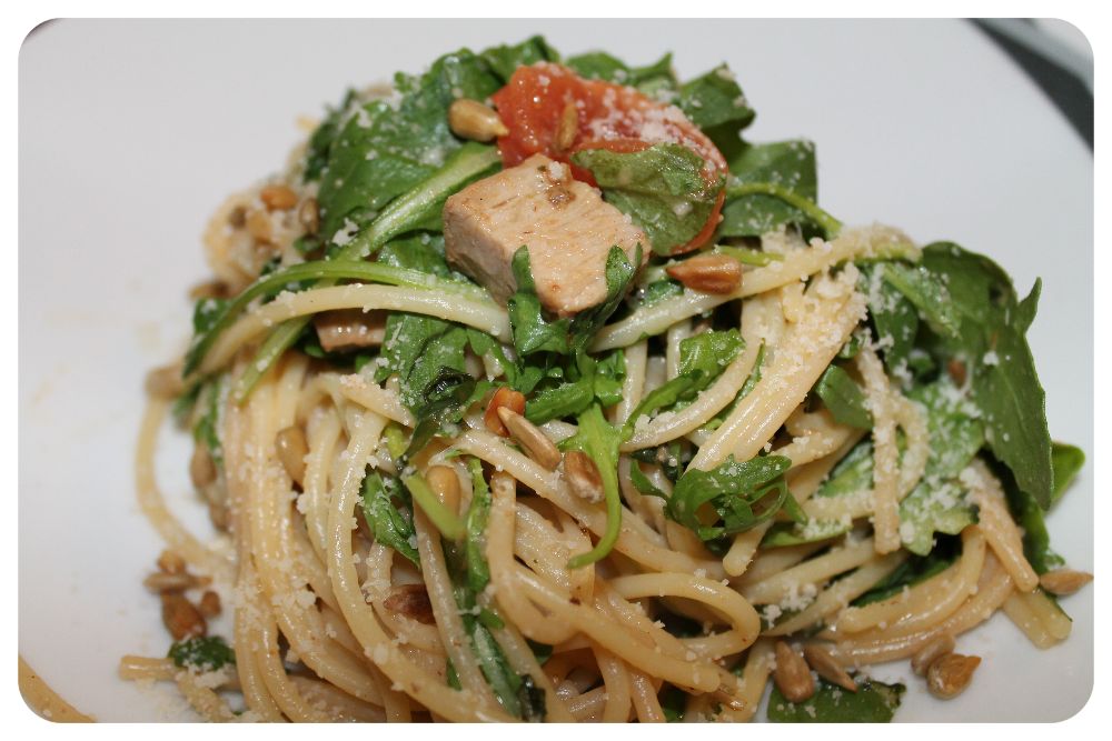 Leicht und schnell, sättigend und lecker! Ein bisschen Fleisch mit Vollkornnudeln und Rucola. Ein feiner Hauch von Knoblauch und Parmesan darf natürlich auch nicht fehlen.
