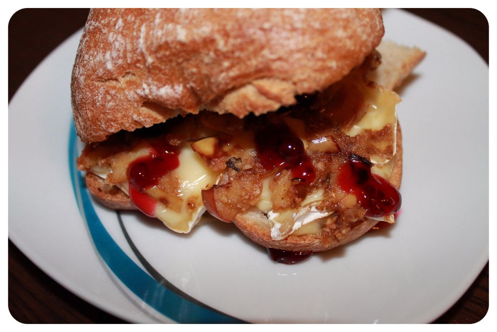 Mein heutiger Wunsch war es, ein Sandwich zu zaubern, welches weihnachtlich angehaucht ist. Mein Freund brachte mich dann auf die gute Idee, Bratapfel mit Sandwich zu verbinden. Nun gibt es heute ein Apfel-Nuss-Camembert Sandwich mit etwas Honig und Preiselbeermarmelade.