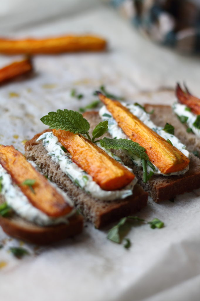 Ich war wieder einmal kurz daheim und musste natürlich den Garten plündern. 😉 Wer meine Instagram Stories verfolgt, der hat vielleicht bemerkt, dass ich knackig, frische Karotten und aromatische Gartenkräuter geerntet habe. Nunja, das schreit ja förmlich nach einem schnellen, köstlichen Sandwich- Montag. Die Farben des fertigen Sandwiches sind ein Traum und der Geschmack erinnert mich an laue Sommerabende. 🙂 Zutaten für 2 Personen: 2 Scheiben Brot 2 große Karotten 3 EL Topfen ½ TL Senf 1 TL Zitronensaft ca. 2 EL gehackte Kräuter – z.B. Schnittlauch, Petersilie, Zitronenmelisse etwas Öl Salz & Pfeffer Zubereitung (ca. 30 Minuten): Den Backofen auf 180°C Umluft vorheizen. Die Karotten waschen und der Länge nach halbieren – anschließend der Länge nach vierteln. Auf ein mit Backpapier belegtes Backblech geben und mit etwas Öl, Salz und Pfeffer vermengen. Für rund 15 – 20 Minuten im Backofen garen bis sie bissfest sind. Die Kräuter hacken und…