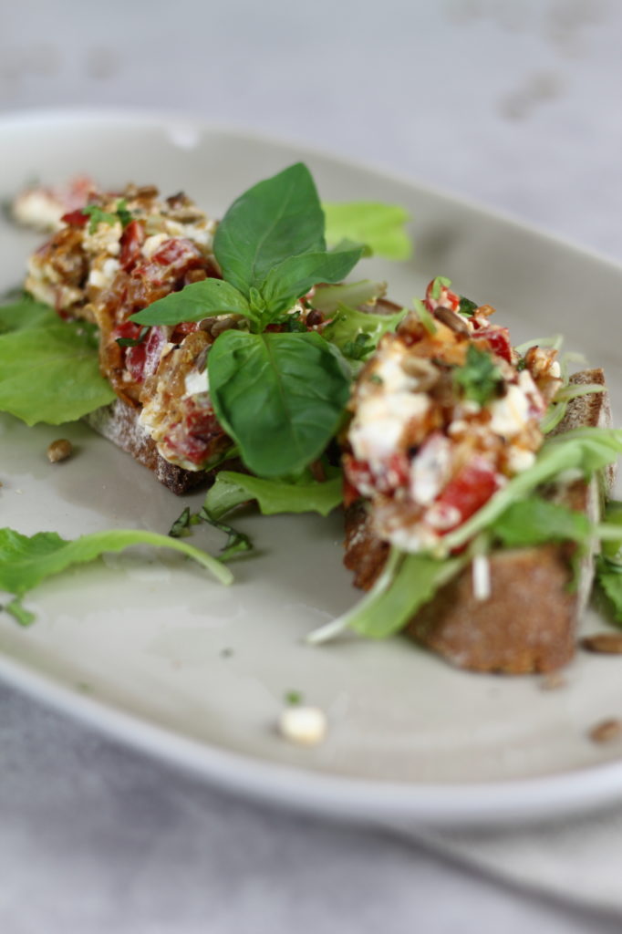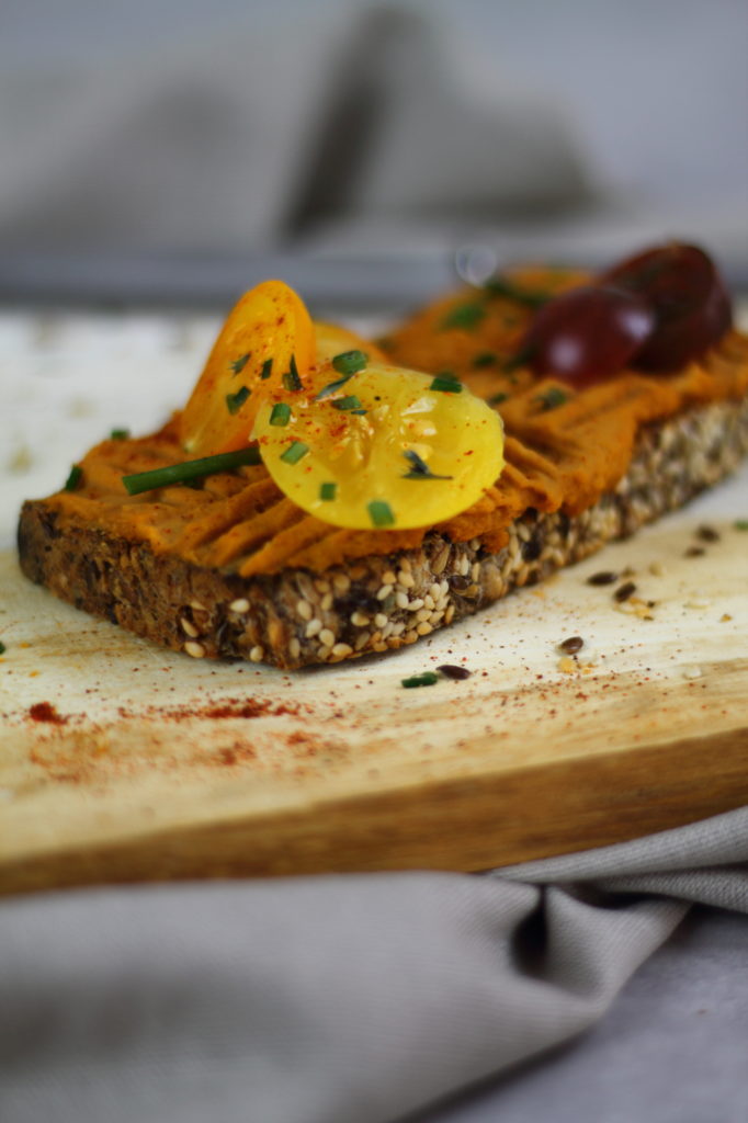 Das heutige Rezept ist wieder einmal wirklich kompliziert, ewig lang und eigentlich möchte man/frau gar nicht damit beginnen… Scherz 😉 Das Rezept von heute ist wieder einmal ein Beweis für meine Hummus- Liebe. Hast du keine Lust auf Tomaten- Hummus? – dann habe ich hier, hier, hier, hier und hier noch weitere Hummus- Rezeptideen (teils mit Kichererbsen oder ohne, mit Gemüse, etc.). Zutaten für 4+ Personen: 4 Weckerl 240 g gekochte Kichererbsen 160 g getrocknete und in Öl eingelegte Tomaten 30 g Tahina (Sesampaste) 50 g Öl (z.B. Olivenöl, Rapsöl, etc.) 1 TL Tomatenmark Salz & Pfeffer Zubereitung (ca. 15 Minuten): Die Kichererbsen mit den getrockneten Tomaten, dem Tomatenmark, dem Öl und der Sesampaste fein pürieren. Mit Salz und Pfeffer abschmecken. Wenn der Hummus zu dick ist, so kann noch etwas Öl oder Wasser hinzugegeben werden. Die Weckerl aufschneiden und toasten. Mit dem Hummus bestreichen und genießen. Guten Appetit! :-)…