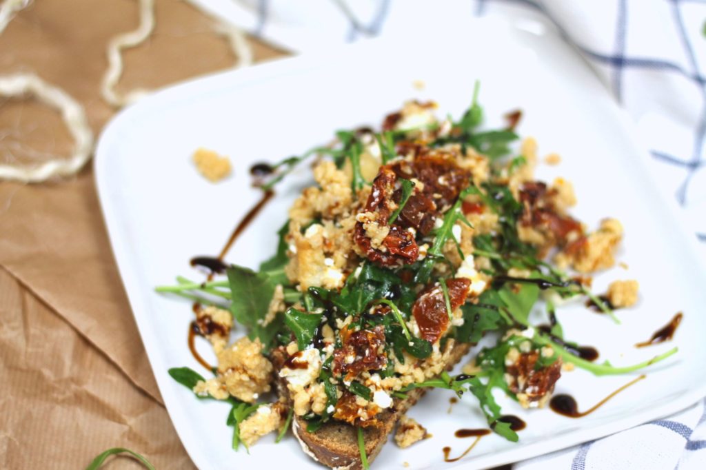 „Und das ist ein Sandwich?“ Genau das waren die Worte meines Freundes, als er das heutige Sandwich gesehen hat. 🙂 Ja, das ist ein Sandwich. Es gibt eine Scheibe Brot und einen Belag, also ja.. Es ist ein Sandwich und es ist noch dazu richtig köstlich. Als es gestern in Wien so schön geschneit hat, da hat mich die Sehnsucht nach Sonne und Urlaub gepackt. Schnell war klar, das nächste Sandwich muss das gewisse „Urlaubs-Feeling“ vermitteln. Was auf keinen Fall fehlen durfte ist Rucola. Dieser verleiht dem Ganzen eine köstliche Würze und eine kräftige und frische Farbe. 🙂 Zutaten für 2 Personen: 2 Scheiben Mischbrot 3 Eier 40 g Hirtenkäse/ Feta- Käse 6 Stück getrocknete und in Öl eingelegte Tomaten 2 Handvoll Rucola Öl Salz & Pfeffer Deko: Balsamico- Glacé Zubereitung (ca. 15 Minuten): Die Eier aufschlagen und verquirlen. Anschließend mit etwas Salz und Pfeffer würzen. Öl in einem…