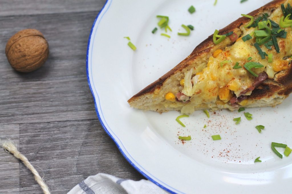 Ich hoffe ihr seid gut ins neue Jahr gerutscht und konntet den Silvesterabend in vollen Zügen genießen. Bei uns gab es wie fast jedes Jahr Raclette am Abend und anschließend Feuerwerk betrachten und ins neue Jahr hineinfeiern. Ich weiß ja nicht wie das bei euch so ist, aber bei uns bleibt nach dem Raclette- Essen einfach immer was übrig. Ein bisschen Speck, ein paar Scheiben Käse, dort und dar noch ein bisschen Gemüse, etc. Deswegen gibt es heute wieder ein Resteverwertungs- Sandwich. Für mich sind solche Sandwiches einfach ideal, da ich es nicht leiden kann, wenn im Kühlschrank 5,6,7 Gläser/ Dosen mit ein bisserl Essen von hier und da stehen. 😉 Zutaten für 2 Personen: 2 Baguettes zum Aufbacken 80 g Mais aus der Dose 50 g Speckwürfel 1 Ei 80 g Bergkäse ½ Zwiebel Salz & Pfeffer Deko: Lauchgrün und/oder Paprikapulver Zubereitung (ca. 30 Minuten): Den Backofen auf 180°C…