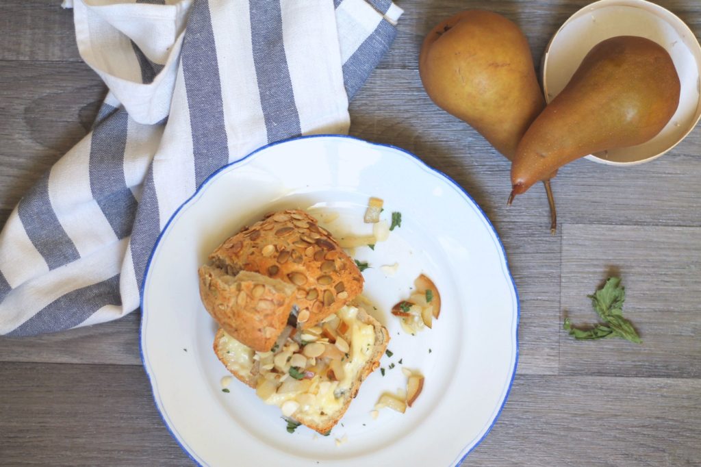 Wer meine Sandwich- Montage schon länger verfolgt, der weiß, dass ich Käse in Kombination mit Obst und Nüssen einfach liebe! 🙂 Heute gibt es wieder einmal solch eine Variante. Der Star des Tages ist ein französischer Camembert mit Birne und Mandeln. Der Käse bekommt durch das Erwärmen im Ofen eine köstliche Note. Das Sandwich ist einfach ideal um es sich auf der Couch gemütlich zu machen, die Beine hochzulegen und sich die neueste Folge der Lieblingsserie anzusehen. Einem gemütlichen Abend kann somit nichts mehr im Wege stehen. Zutaten für 2 Personen: 2 Kürbisweckerl 250 g französischer Camembert (rund, im Holzrahmen) 250 g Birne 1 TL Agavendicksaft wenige Tropfen Vanilleextrakt Mandelblättchen etwas Öl Zubereitung (ca. 30 Minuten): Den Backofen auf 200°C Umluft vorheizen. Den Camembert vom Papier befreien und wieder in den Holzrahmen setzten. Mit dem Messer ein Kreuz auf der Oberseite einschneiden. Wenn der Backofen vorgeheizt ist, den Käse…