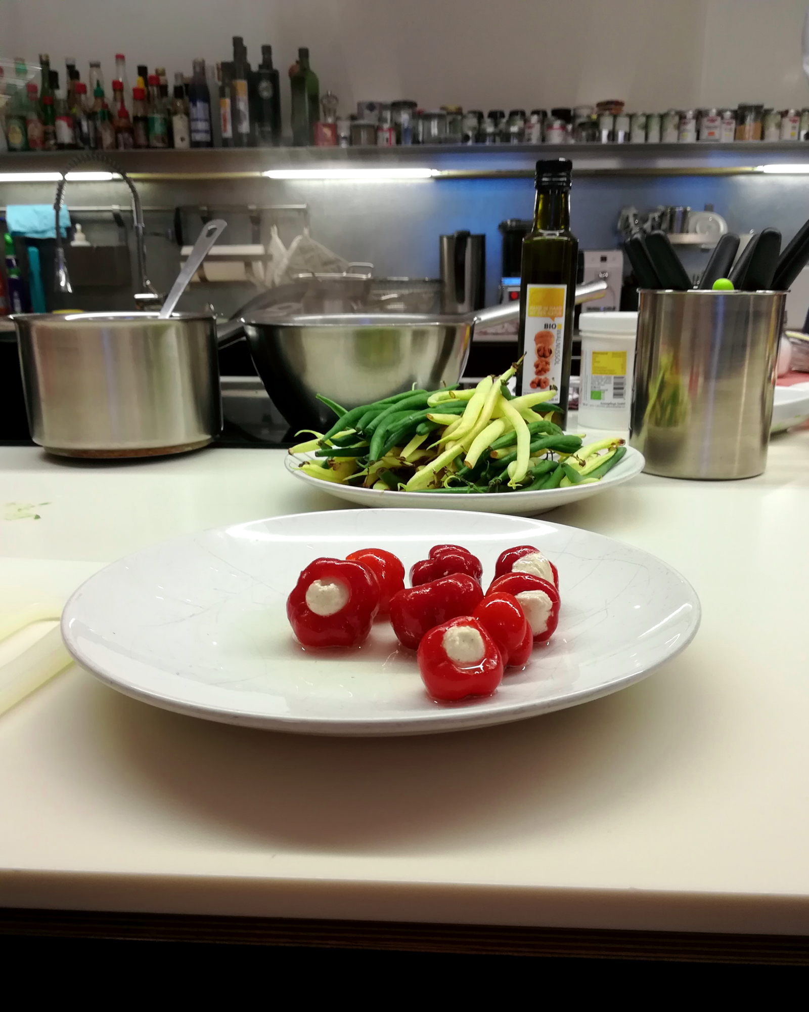 Nun gut, wie starte ich jetzt am besten? Ein Professor hat während meines Studiums einmal gesagt – beim Schreiben sollte es nicht „verkompliziert“ werden, sondern der Moment und die Gefühle sollen eingefangen und festgehalten werden. Also dann versuche ich das mal. Wie schon kurz angerissen wurde, wurde ich letzte Woche zu einem besonderen Kochworkshop eingeladen. Ich war etwas nervös oder nein, ich war ein bisserl aufgeregt – positiv aufgeregt, denn ich habe mich auf diesen Abend schon sehr gefreut, jedoch wusste ich nicht genau, was mich erwarten würde. Die Bim- und Busfahrt war relativ kurz und nach wenigen Schritten wurde ich herzlich willkommen geheißen. Sofort fühlte ich mich wohl und meine Aufregung war wie verflogen. Ich habe die helle und kreativ gestaltete Location „Das Kochatelier“ betreten und nahm sogleich den wohligen Geruch von Risotto war. Genauer gesagt Zucchini- Kernöl- Risotto mit Schafsgupferl von „Die Käsemacher“. Ich habe noch nie Kernöl in einem Risotto gegessen und war schon richtig gespannt wie das schmecken würde. Passend dazu wurde ein harmonischer Tropfen Wein vom Weingut Polz gereicht. Risotto und Wein – mein Abend war gerettet! 😉 Als Kleingruppe haben wir beim Zubereiten geholfen, hilfreiche Tipps aufgeschnappt und über eine fachliche Schulter ins Häferl geschaut.