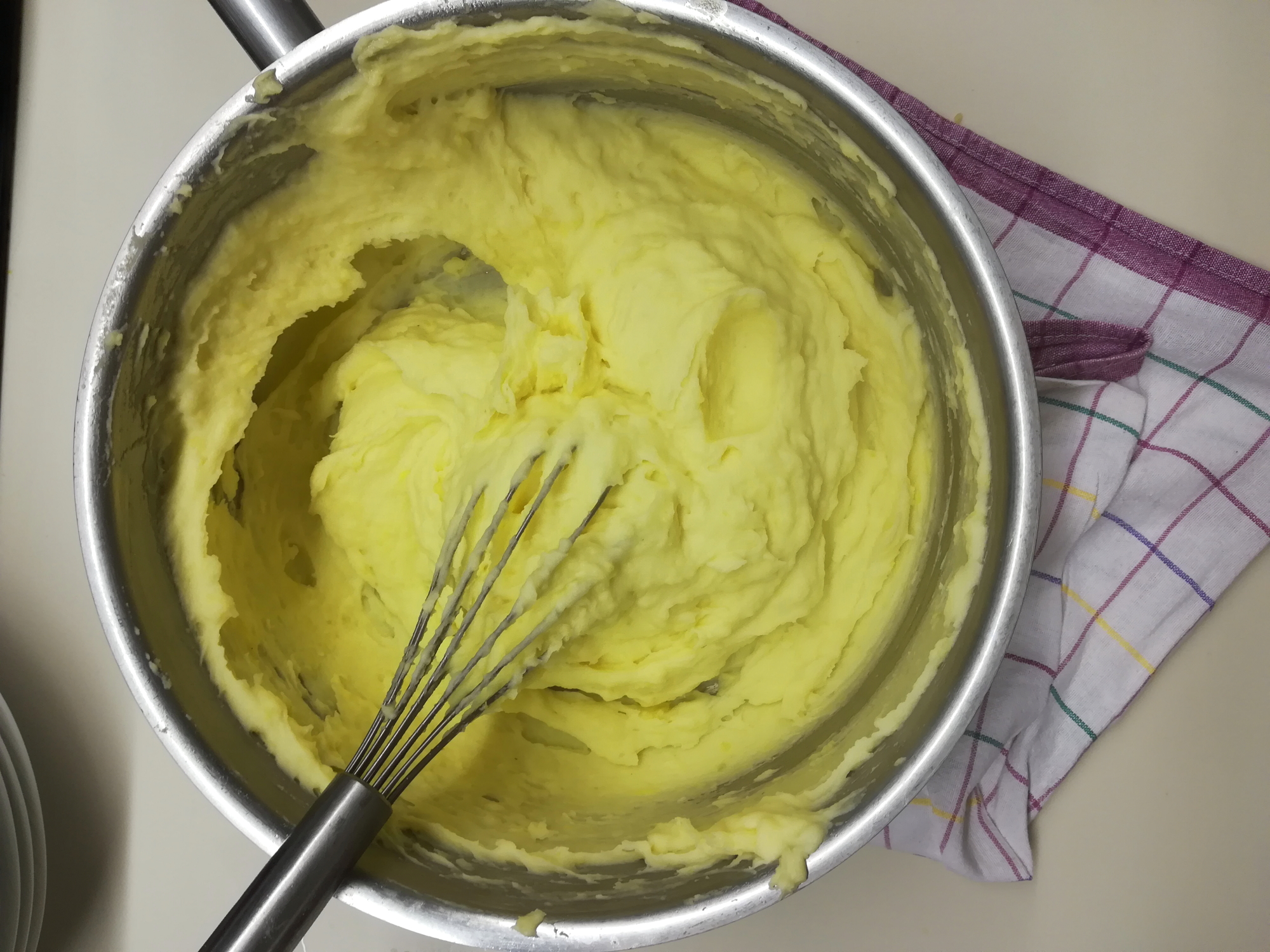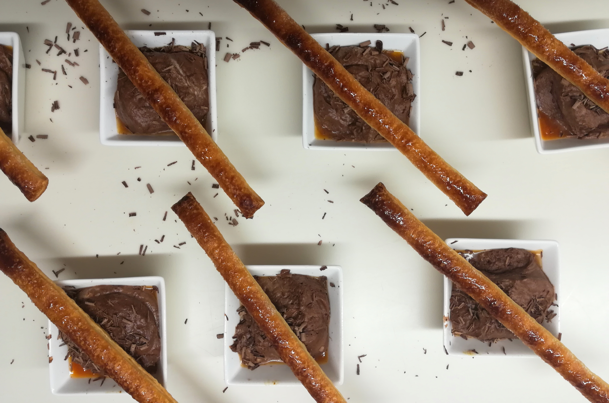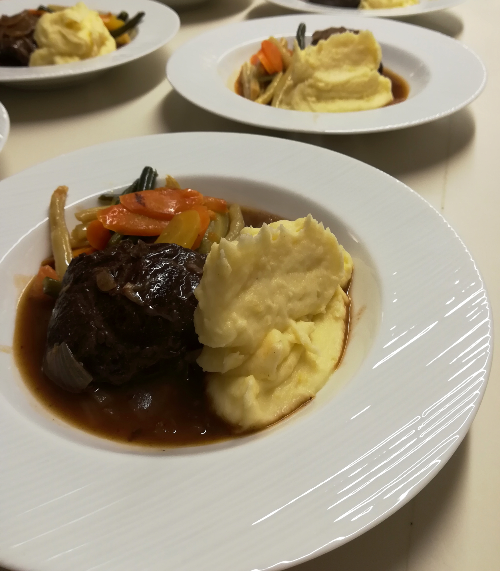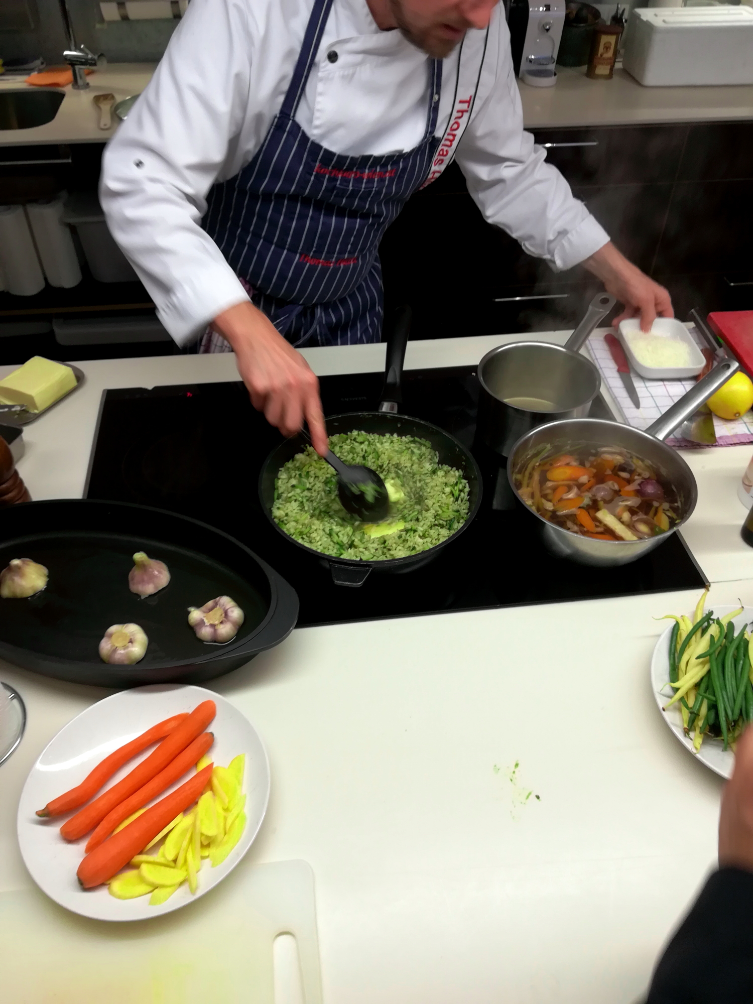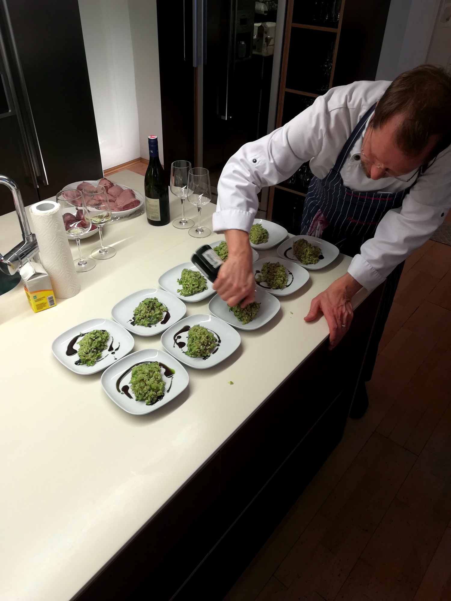 Das Risotto wurde angerichtet, jede/r nahm sich einen Teller (ganz unkompliziert und ohne großem Chichi), wanderte in den Nebenraum und nahm an dem großen, massiven Holztisch Platz. Während dem Essen lauschten wir einer ausführlichen Weinbeschreibung und natürlich musste der vorgestellte Wein anschließend auch probiert werden. 😉 Nach dem Verspeisen des Risottos wurde unkompliziert, beinahe wie in den eigenen vier Wänden, gemeinsam abserviert und das nächste Gericht zubereitet, angerichtet und verspeist. Die geschmorten Schweinsbackerl waren ein Traum – saftig, zart und würzig. Den Abschluss bildete eine Mousse au chocolat auf Marillenröster mit knusprigen Blätterteigstangerln.
