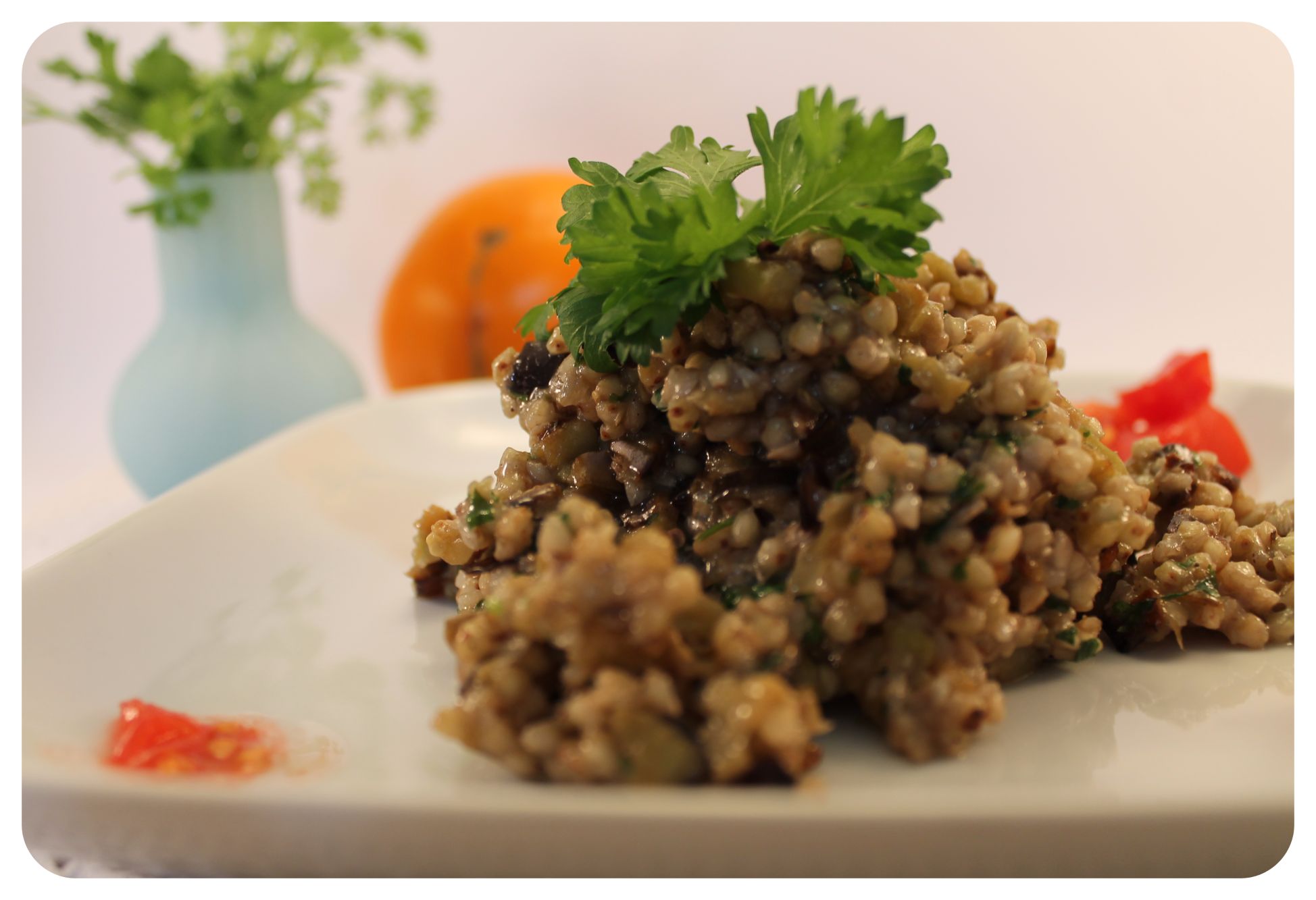 Wenn der Buchweizen weich ist, jedoch noch Biss hat, mit den Melanzaniwürfeln vermengen und die Petersilie unterheben. Mit Salz und Pfeffer würzen.