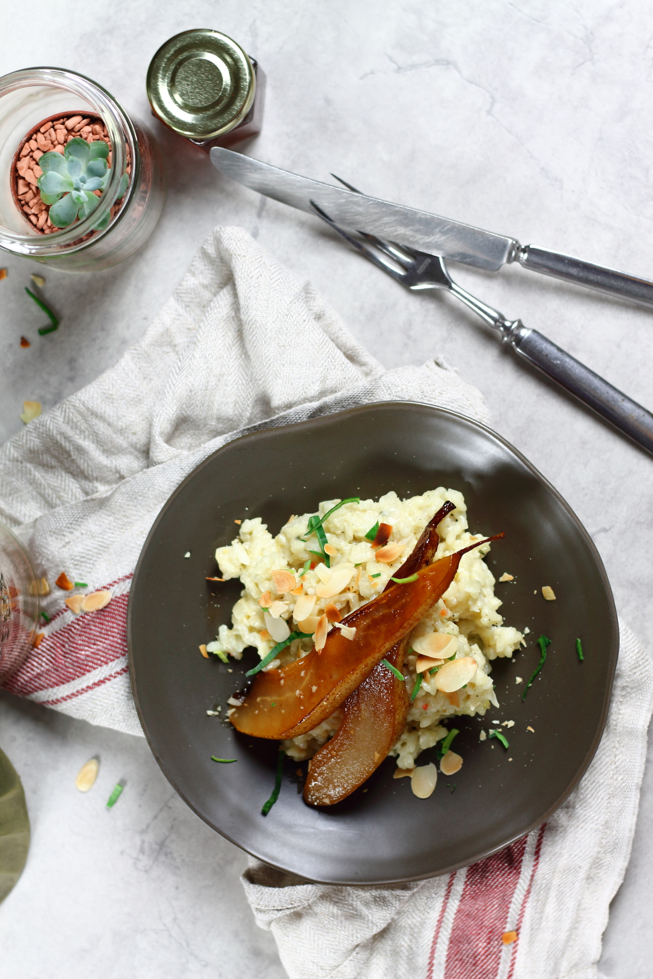 Das Risotto auf den Tellern verteilen und mit den Birnenspalten, Mandelblättchen und dem Lauchgrün toppen.