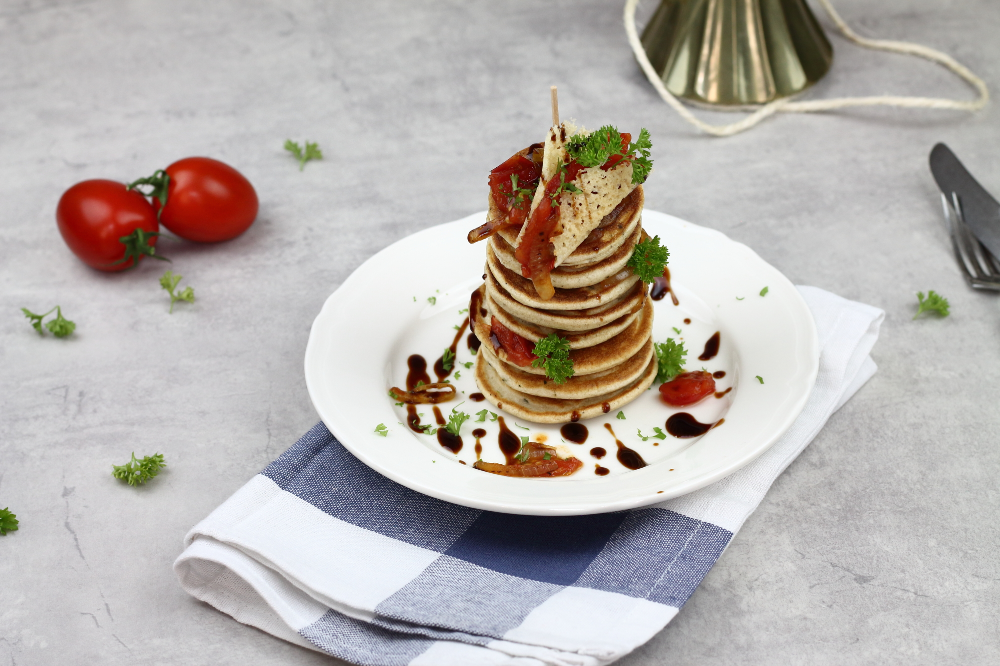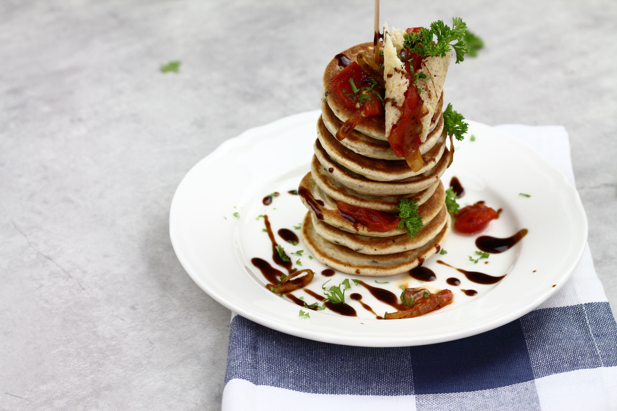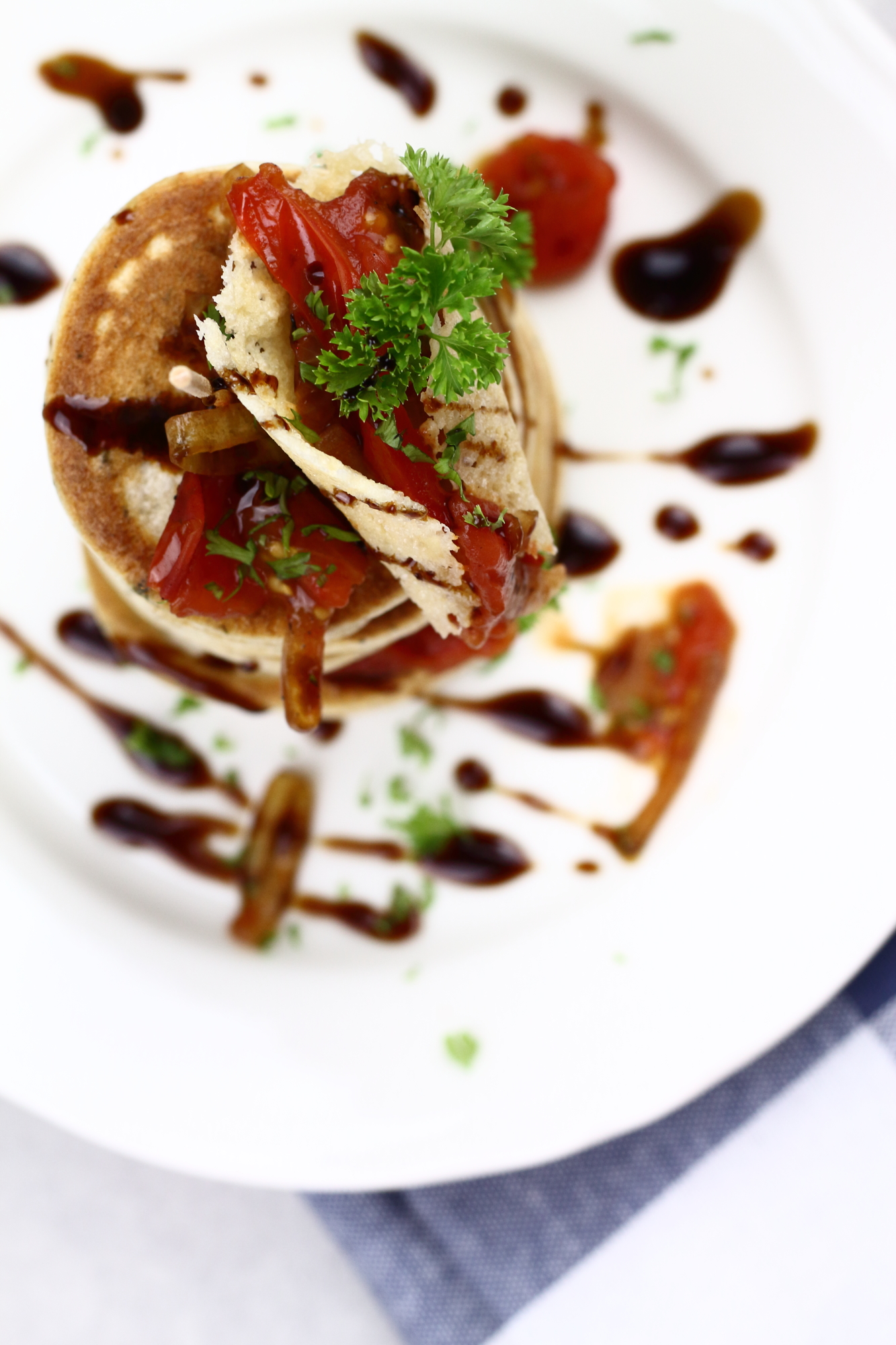Ein Sonntag ohne Pancakes ist machbar, aber nur halb so schön. 😀 Scherz beiseite. Ich mache mir nicht jeden Sonntag Pancakes – eigentlich mache ich mir nur sehr selten welche. Wenn ich mir jedoch welche mache, dann gerne verschiedene. Diesmal habe ich pikante Pancakes mit Kräutern, Tomaten, Zwiebel und Parmesan probiert und OMG sind die lecker. :-O Die Rezeptur kann auch ganz einfach in süße Pancakes umgewandelt werden – einfach die „pikanten Zutaten“ weglassen und z.B. mit frischen Früchten toppen. ♥