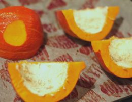 P.S. Mit einer Gabel kann ideal getestet werden, ob der Kürbis schon gar ist. Dafür den Kürbis einfach anstechen, dann spürt Mann/Frau gleich ob er bereit zum Essen ist. 🙂