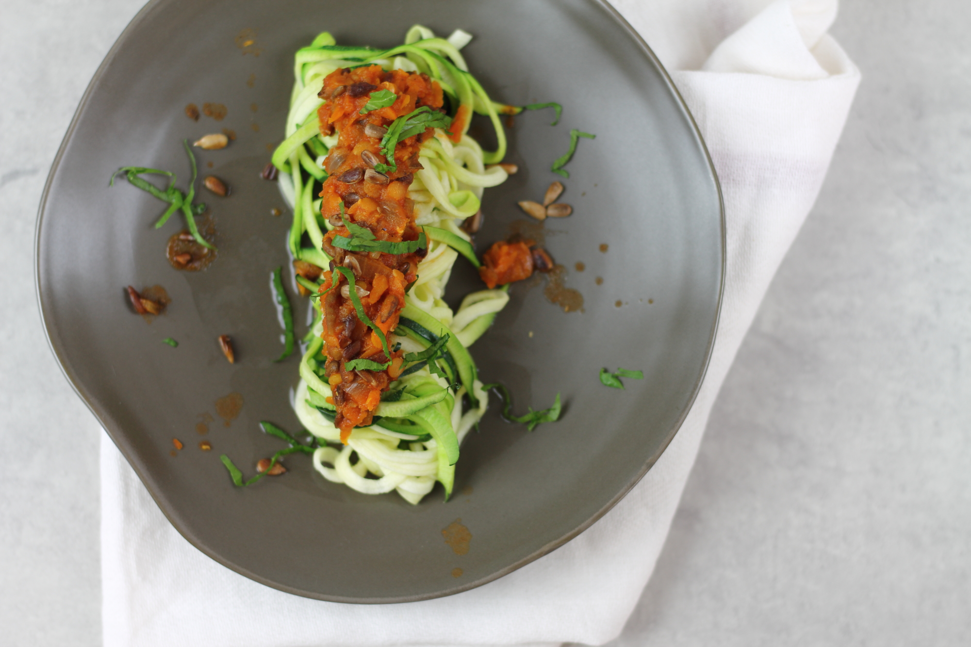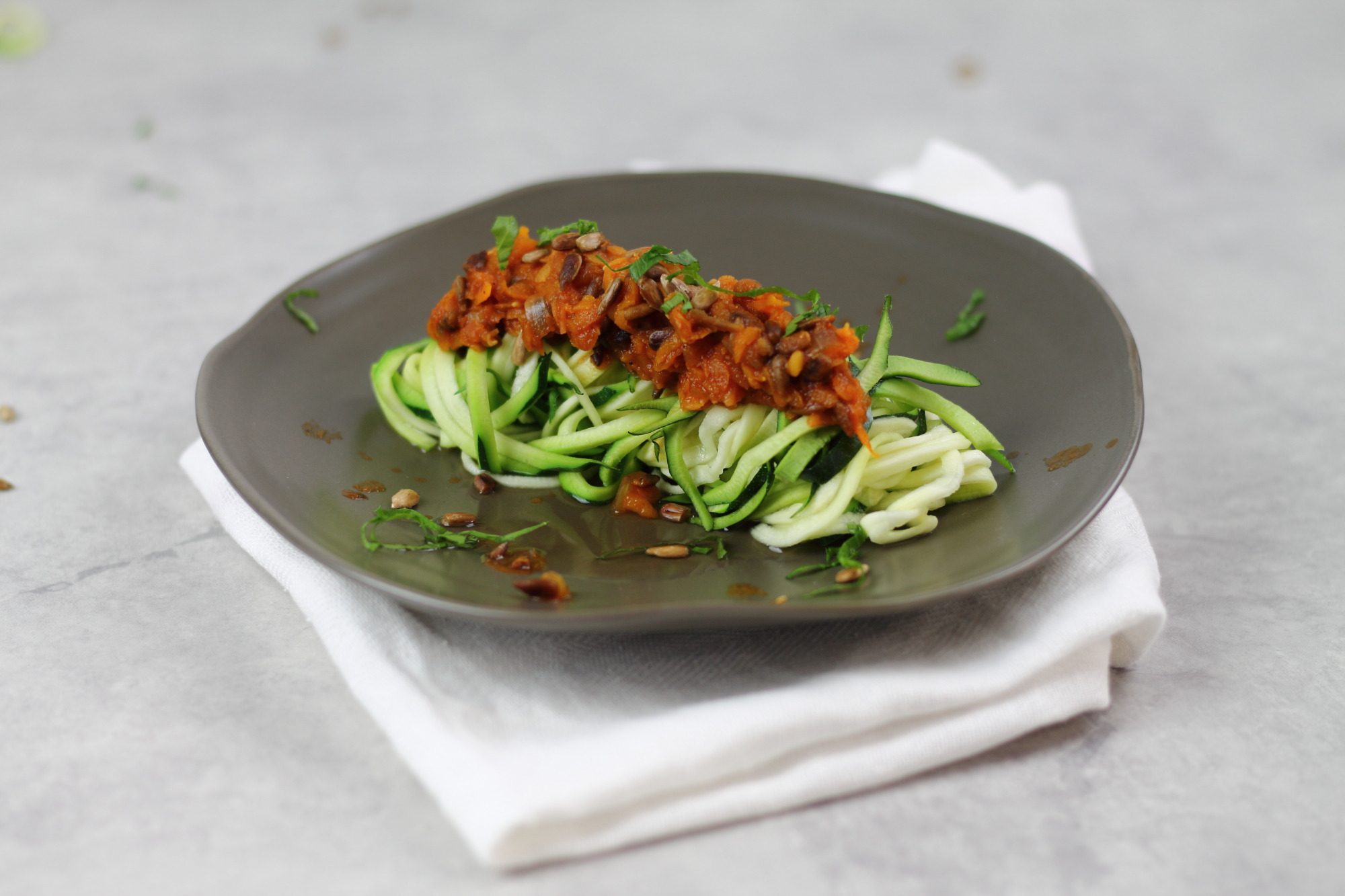 Die Zucchini waschen (wenn gewünscht zuvor schälen) und mit einem Gemüsespiralschneider in Gemüsespaghetti verwandeln. Anschließend in Salzwasser bissfest „kochen“ (eher kurz blanchieren). Tipp: Wenn es schnell gehen muss, einfach die Zoodles auf ein Suppenteller geben, ein wenig Wasser hinzugeben (ungefähr 2 – 4 cl) und für rund 3 Minuten in der Mikrowelle garen.