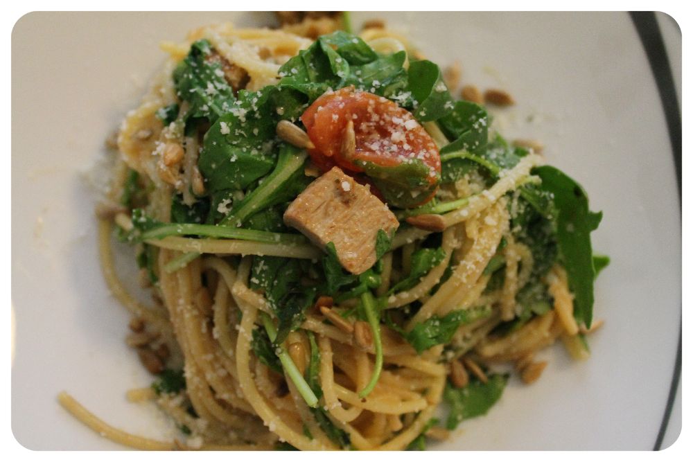Leicht und schnell, sättigend und lecker! Ein bisschen Fleisch mit Vollkornnudeln und Rucola. Ein feiner Hauch von Knoblauch und Parmesan darf natürlich auch nicht fehlen.