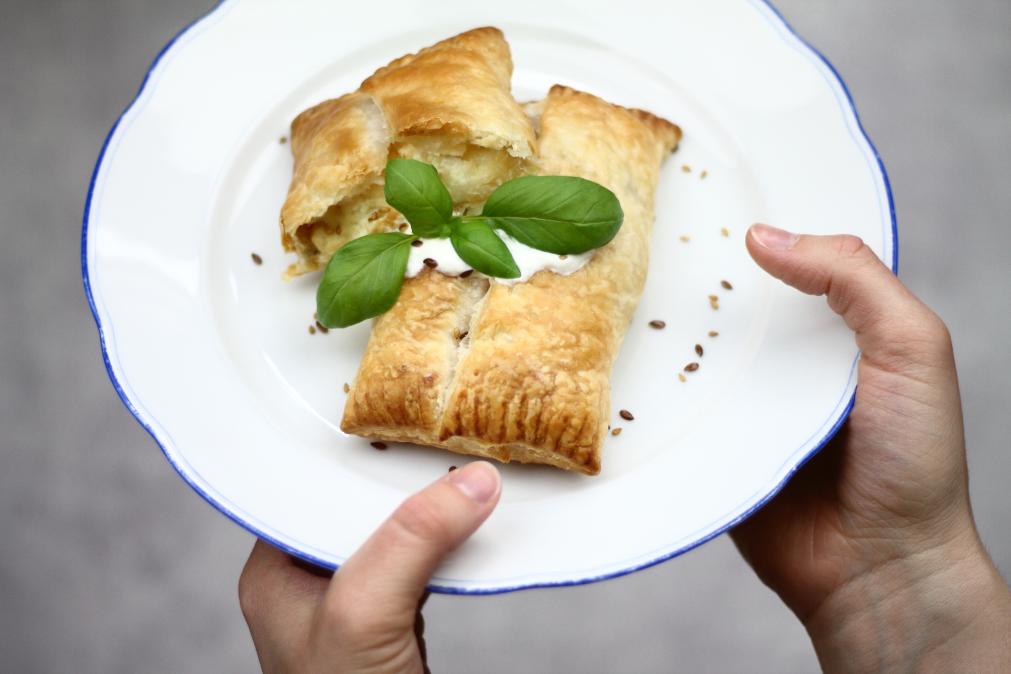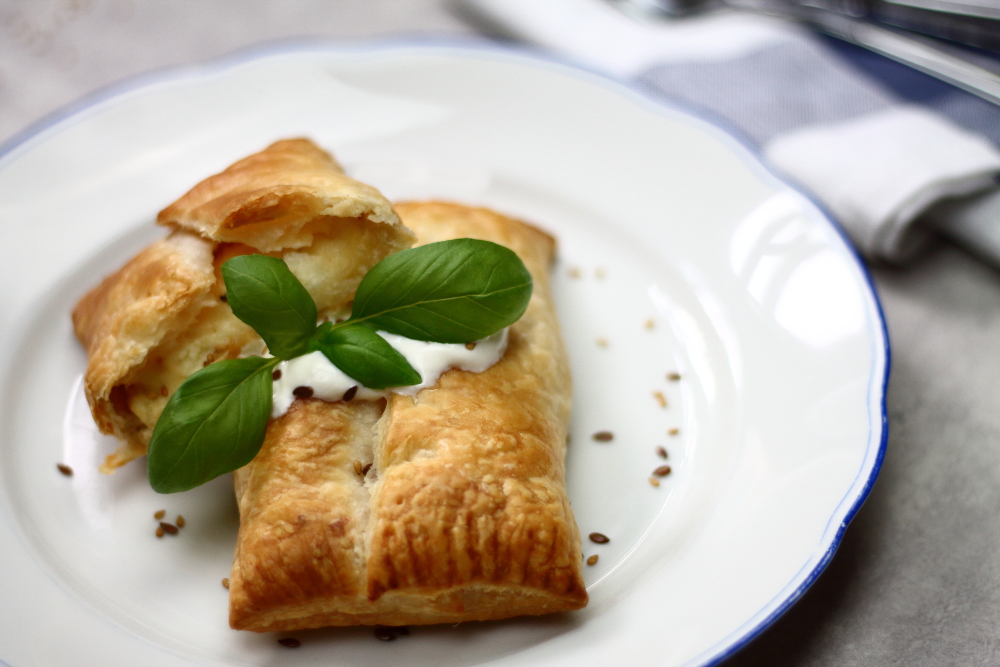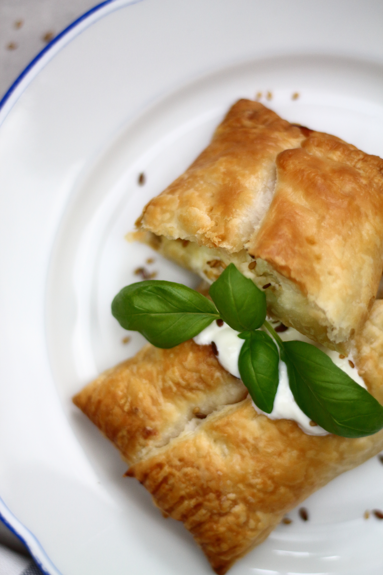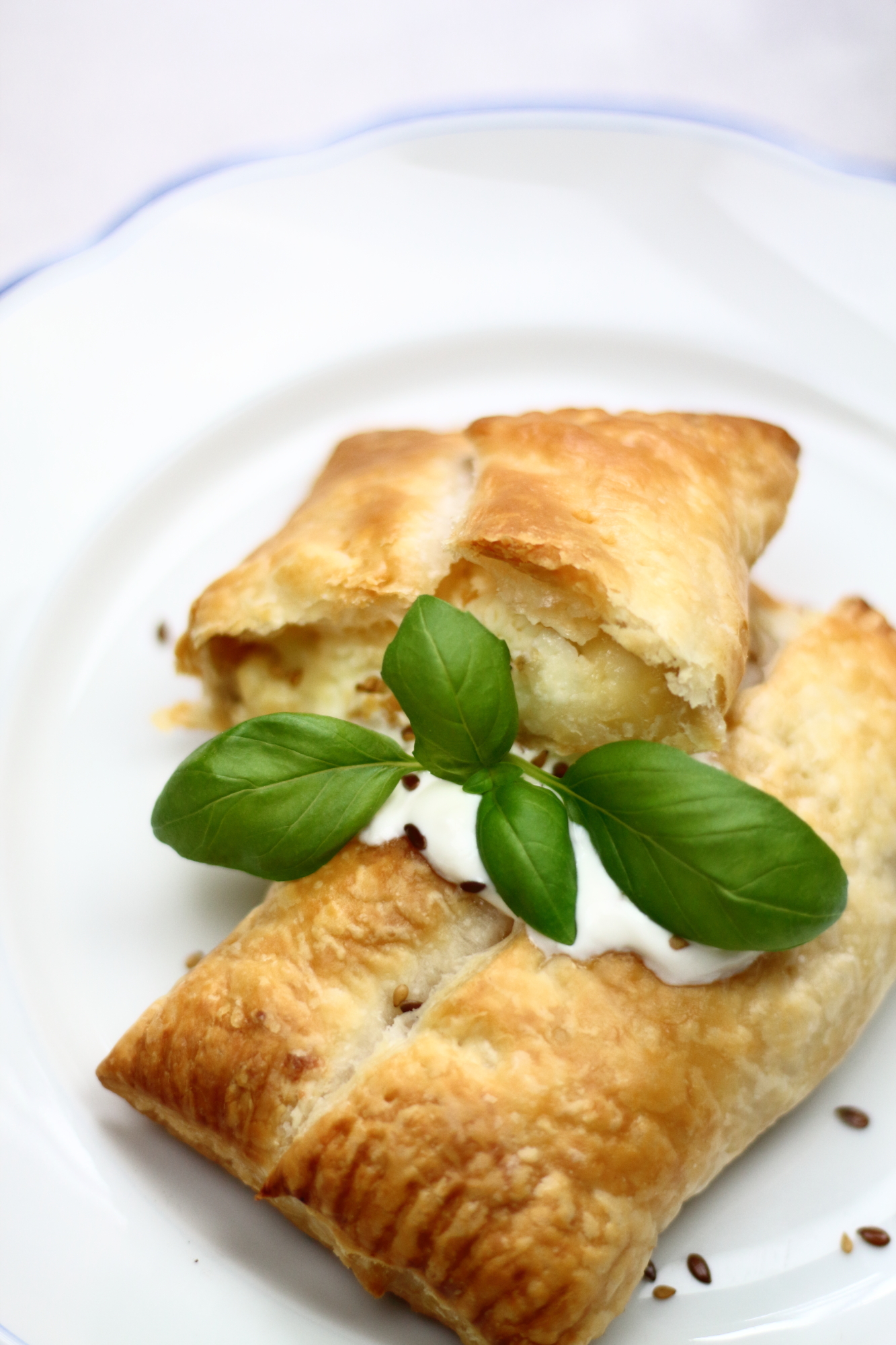 Es ist wirklich schwer nach einem Nachtdienst nicht in einen Kaufrausch zu verfallen. Meist bin ich hungrig, müde und anfälliger für verführerische Produktverpackungen. Eigentlich wollte ich ja heute nur Weckerl und Buttermilch kaufen – naja.. dem war nicht so. Die Aktion von heute Früh hat jedoch nicht nur Nachteile, da ich so auch auf die Idee für das heutige Blog- Rezept gekommen bin. Köstlich knusprige Schafkäseblätterteigtaschen mit Honig und getoppt mit ein paar Blättern Basilikum. Jetzt bin ich zwar immer noch müde, aber immerhin happy und gesättigt.