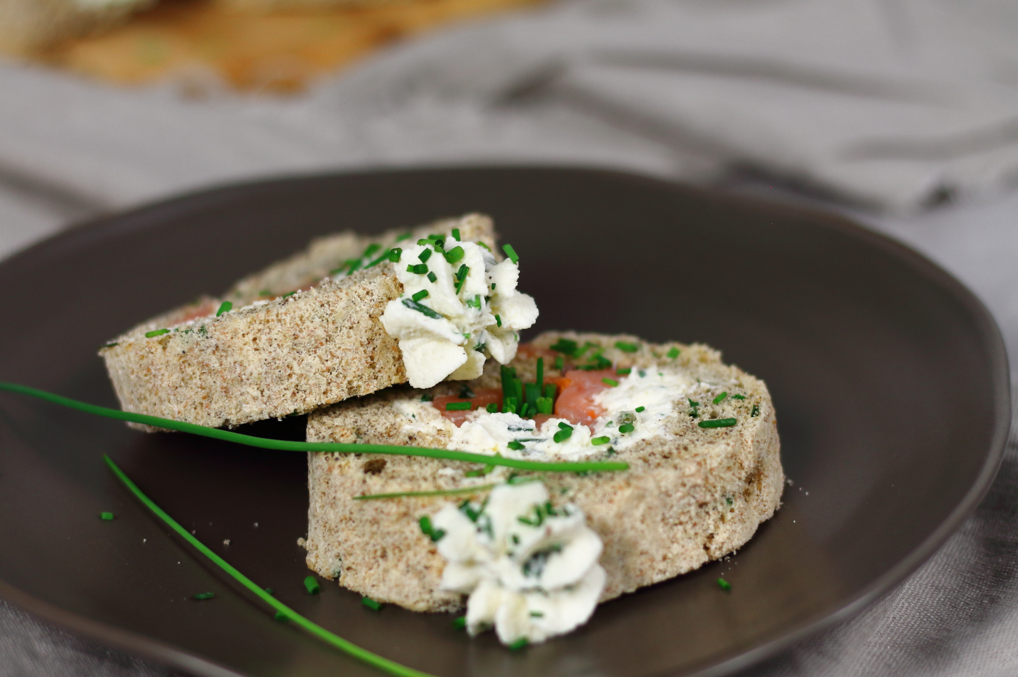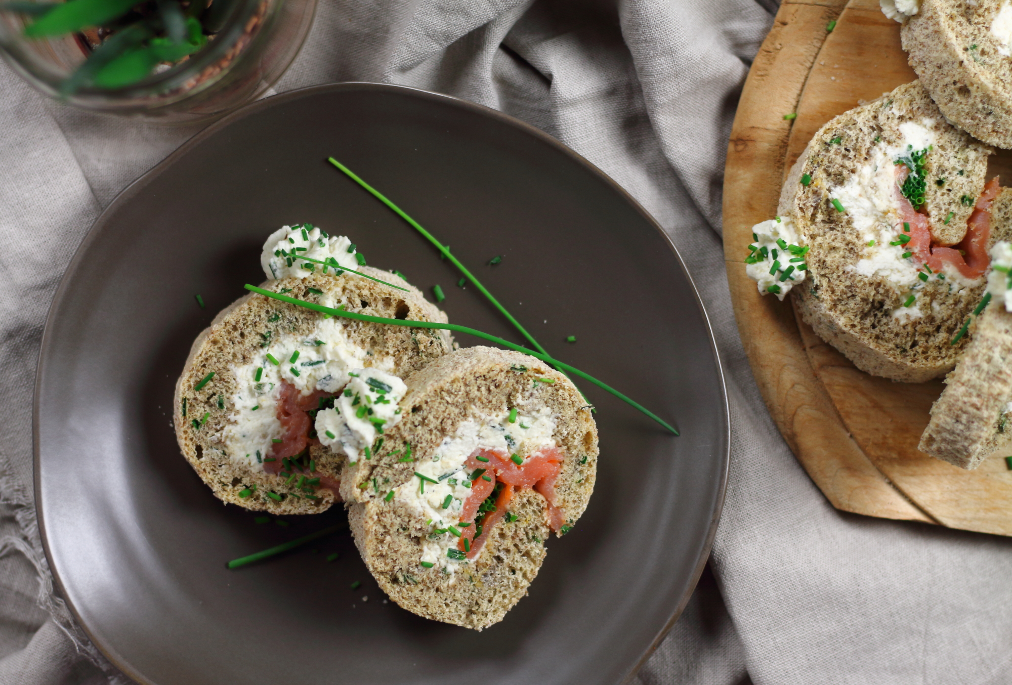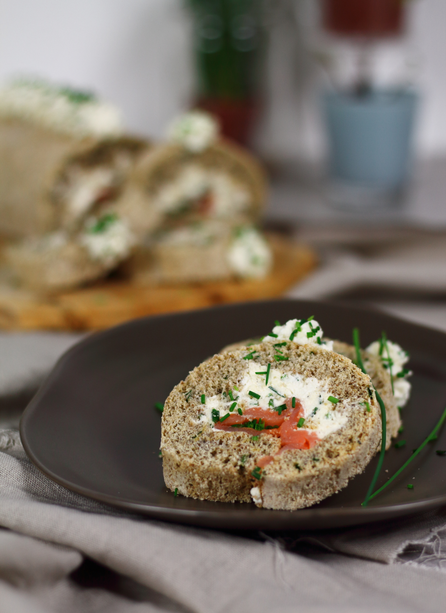 Die ausgekühlte Roulade behutsam ausrollen, mit der Sahnecreme bestreichen, mit dem Lachs belegen und wenn gewünscht noch einzelne Schnittlauchhalme in die Mitte der Roulade legen. Nun wieder mithilfe des Geschirrtuchs einrollen. Die restliche Creme in einen Spritzbeutel geben und die Roulade damit toppen. Zum Schluss noch etwas fein geschnittenen Schnittlauch über die Roulade streuen.