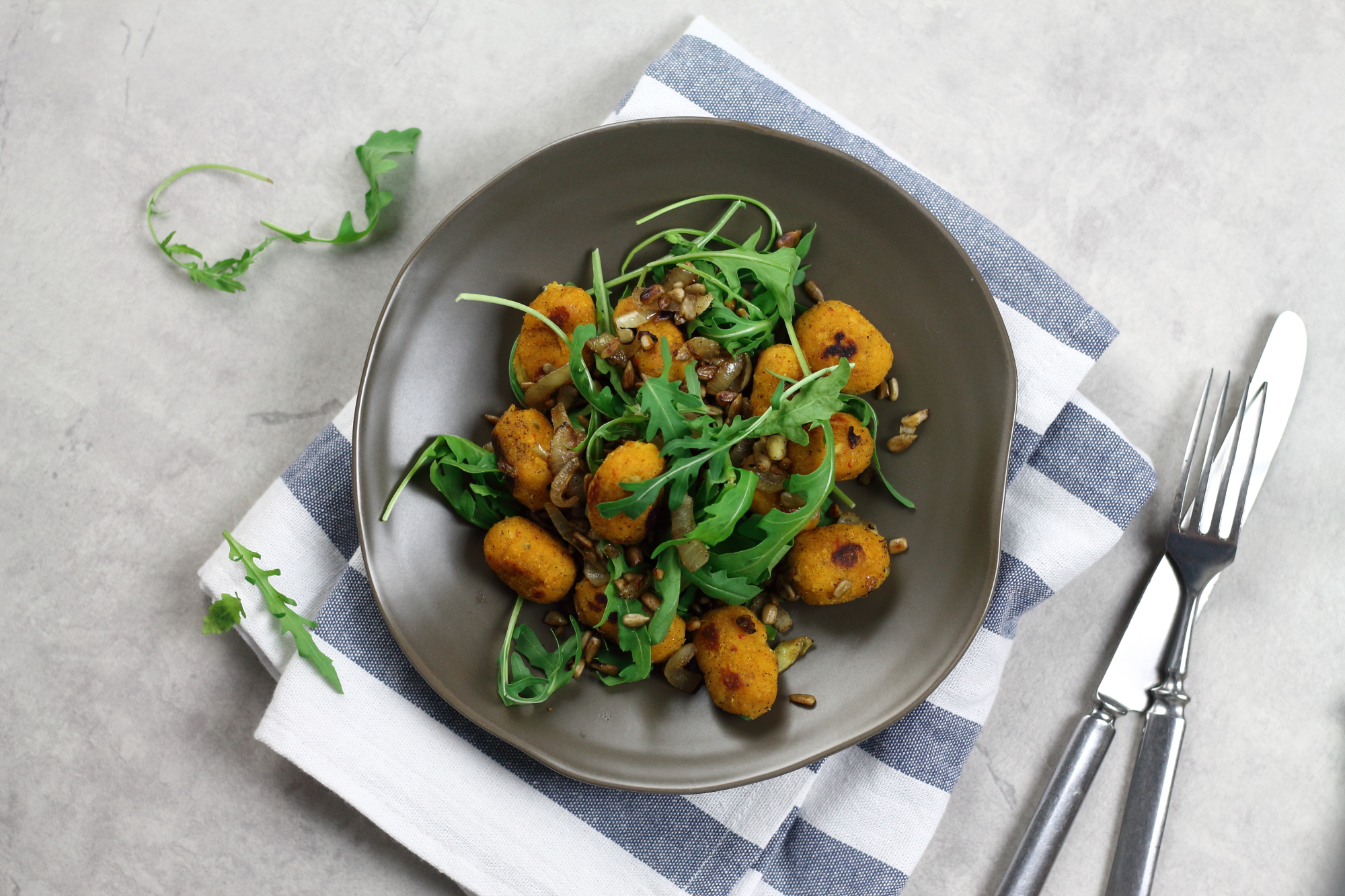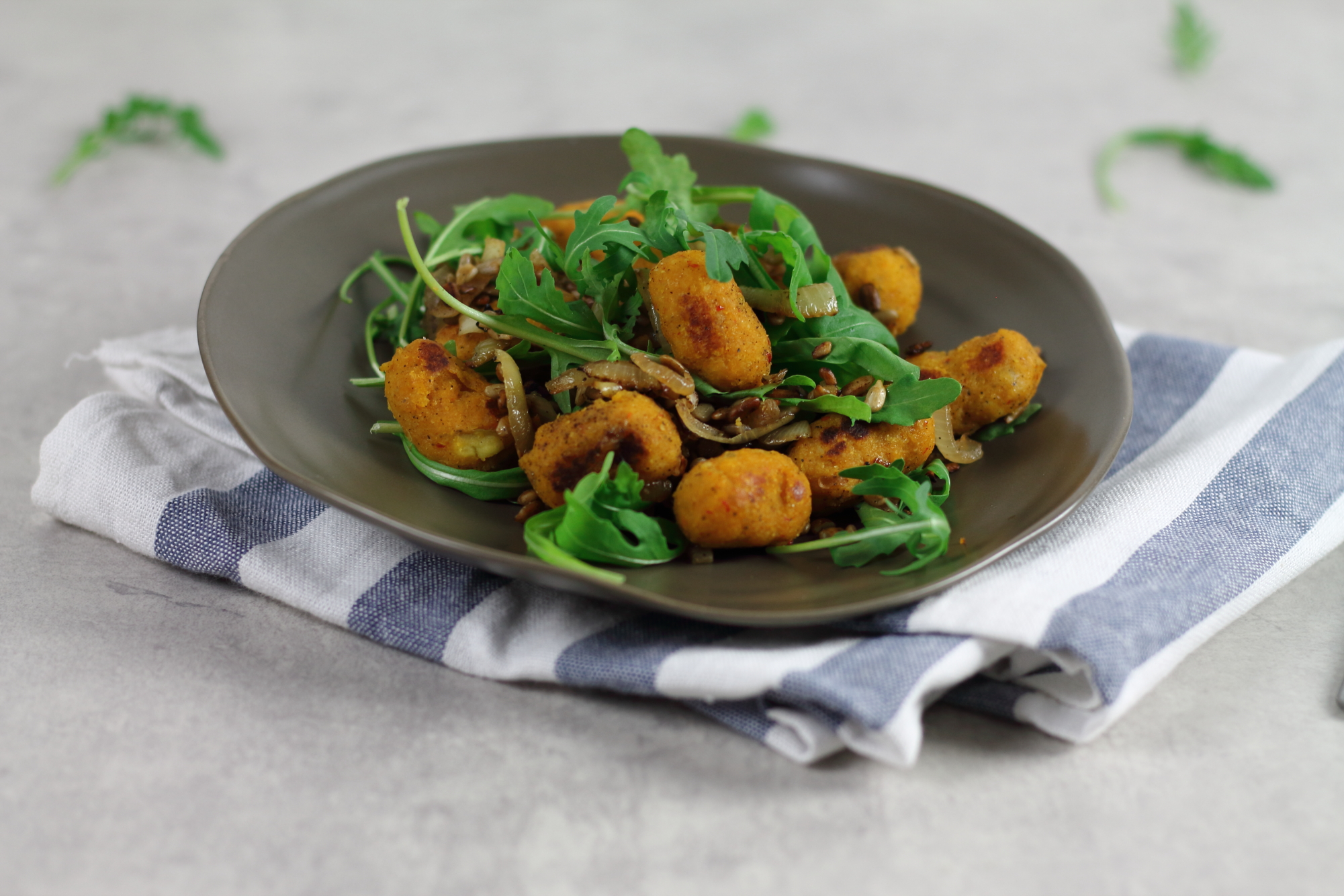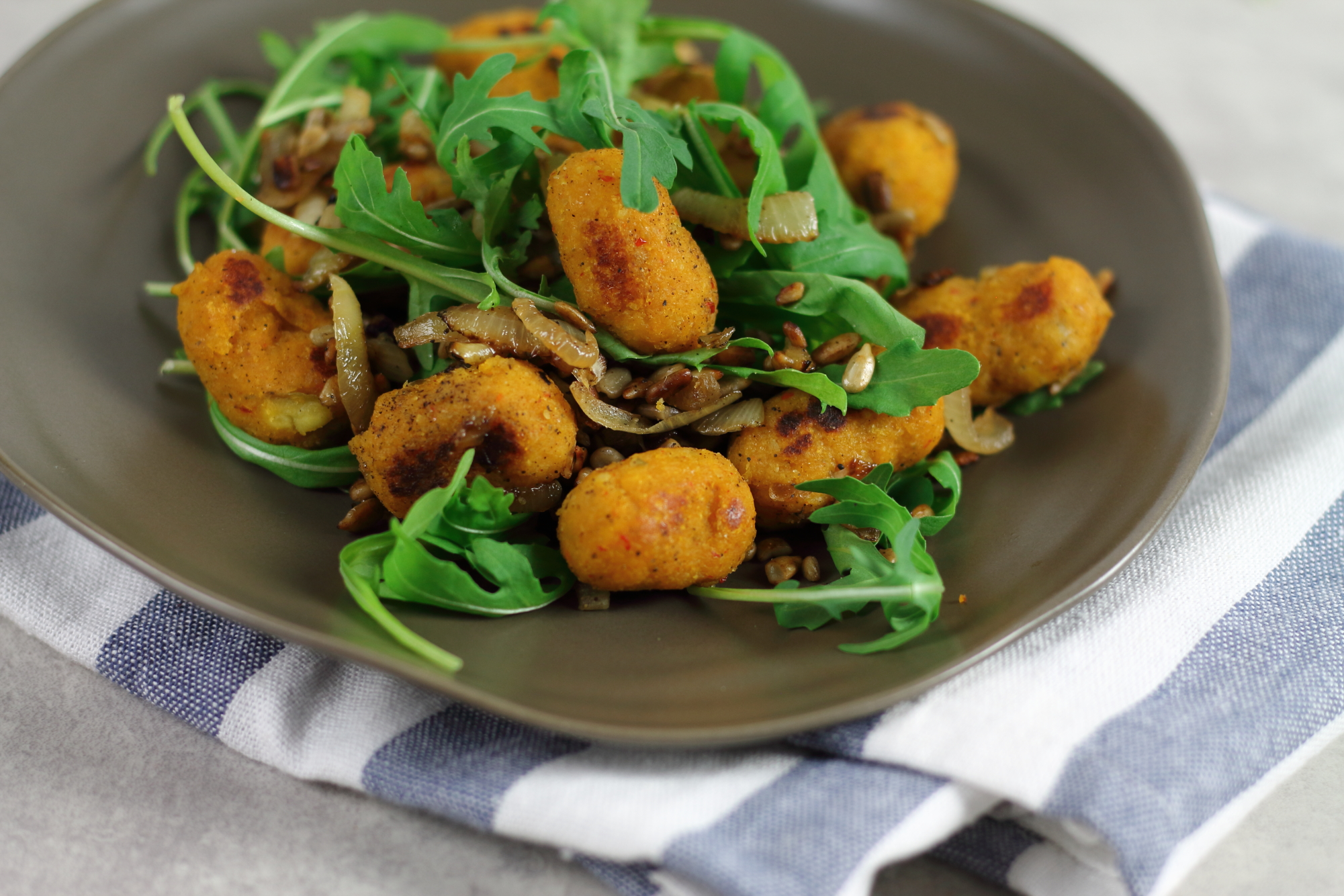 Nun die Gnocchi solange in Salzwasser kochen, bis sie an der Oberfläche schwimmen. Die kleinen Leckerbissen abseihen, kurz mit kaltem Wasser abschrecken und in etwas Öl goldbraun anbraten. Zum Schluss die angebratenen Sonnenblumenkerne und Zwiebeln hinzugeben. Vor dem Servieren den Rucola unter das Ganze heben und genießen.