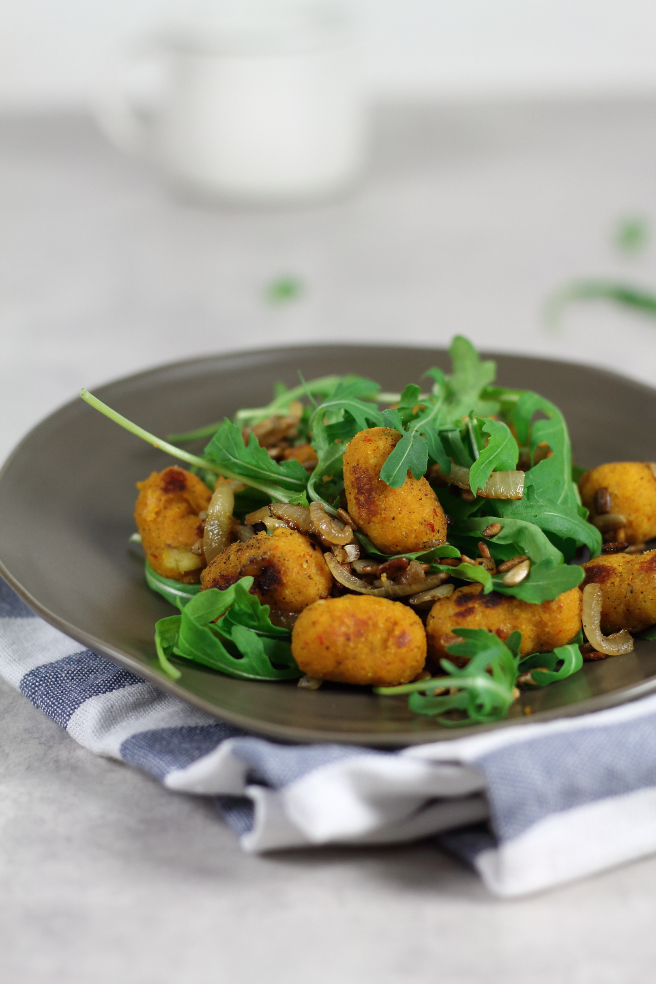 Vertrage ich jetzt auf einmal kein Gluten mehr oder warum sind diese Gnocchi glutenfrei? Ich bin mir sicher, vielleicht hat sich das der eine oder die andere gerade gefragt. Ich habe keinerlei Probleme mit Gluten, vertrage es recht gut (ganz normal würde ich sagen), aber ich probiere gerne neue Sachen aus. Ja, eigentlich würde ich schon fast sagen, ich experimentiere richtig gerne mit Lebensmitteln. Das klingt jetzt vielleicht ein bisschen verschwenderisch, aber ich kann dich beruhigen – es wandert nichts in die Tonne. Mein Freund ♥ tut mir ja eh ein bisschen leid, denn es wird alles gegessen – egal ob es gelungen ist oder ob es nicht gelungen ist. Ich glaube auch, dass ich diese Liebe zum Experimentieren bereits sehr früh als Kind entwickelt habe – speziell in puncto Essen. Früher, das ist jetzt sicherlich schon 15 Jahre her, hatten wir zu Hause am Land im Garten drei Laufenten. Wunderschöne Tiere, die von uns natürlich auch Namen erhalten haben und eigentlich dafür da waren, dass sie die Schnecken in Omas Gemüsegarten fressen. Irgendwann waren aber die Schnecken rar im Garten und wir Kinder haben begonnen für die Enten auswärts Schnecken zu sammeln. Ich kann euch sagen, das hat richtig Spaß gemacht! 😀 Wie Kinder nun mal sind, kamen mein Bruder, mein Cousin und ich auf die glorreiche Idee, wir könnten für die Enten etwas kochen. Es gab dann neben Nacktschnecken auf Wiesensalat, auch Sandsuppe und Gemüserestlpfanne. Du glaubst es jetzt vielleicht nicht, aber die Enten haben das auch wirklich gefressen.