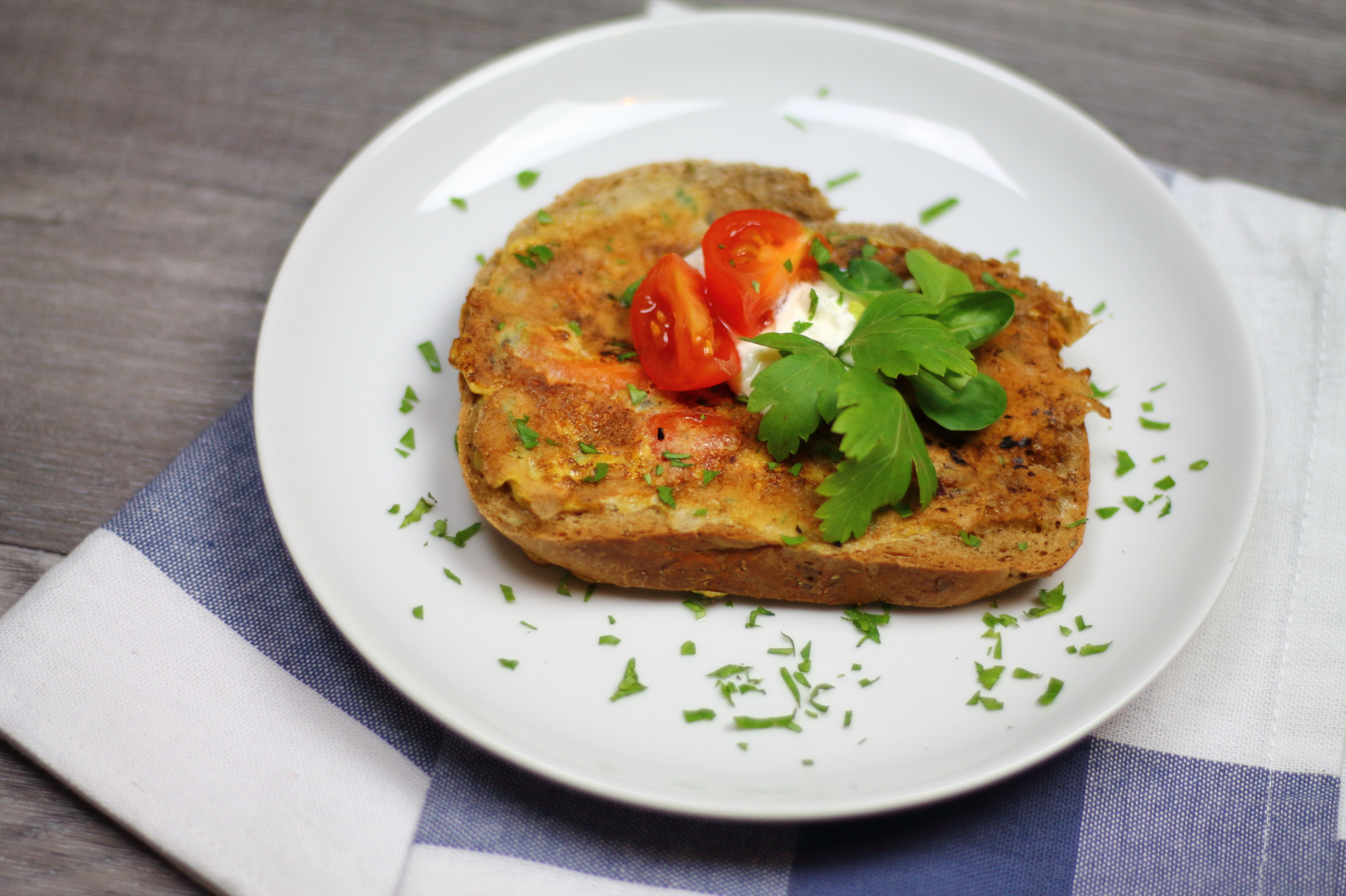 Nun solange anbraten, bis das Ei beginnt zu stocken und die Unterseite des Brotes goldbraun und knusprig ist.