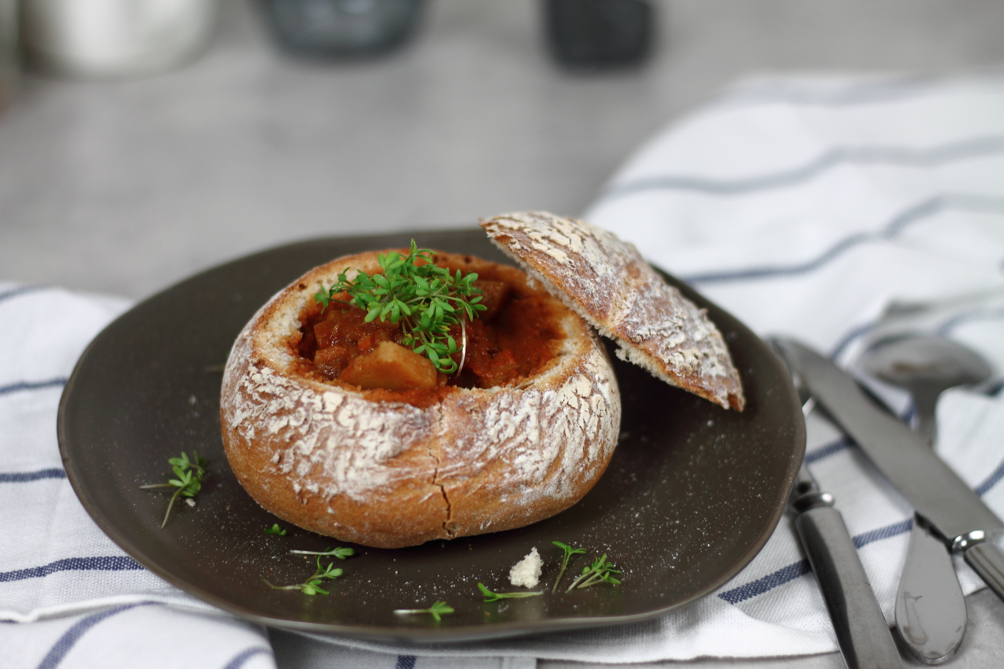 Zum Schluss nochmals alles abschmecken. Die Wachauer- Weckerl aufschneiden, aushöhlen und mit dem Gulasch füllen. Mit etwas Joghurt/Sauerrahm und Kresse toppen.