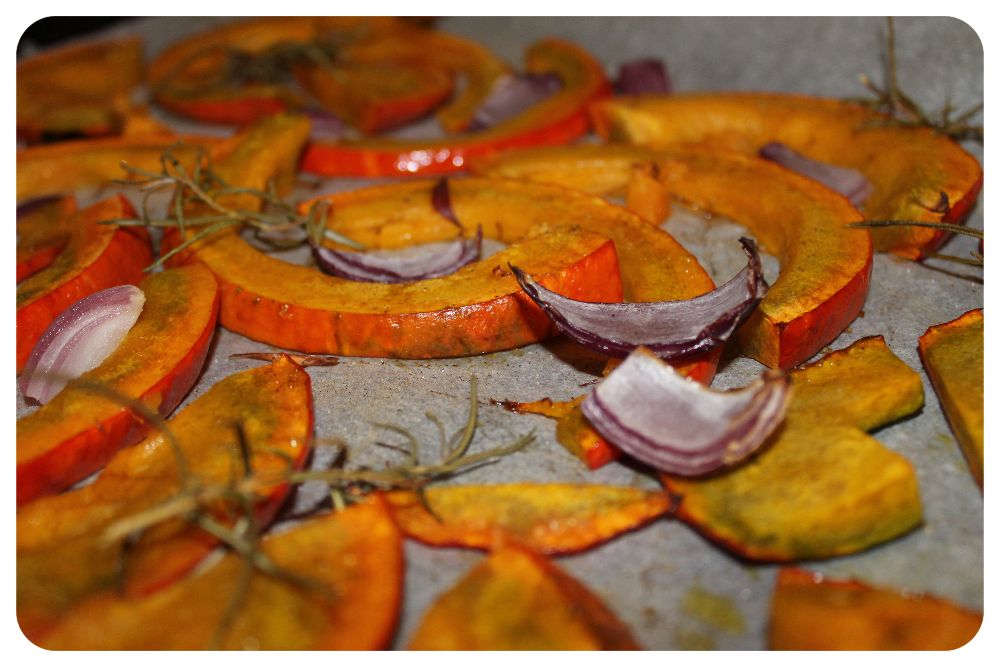 Hokkaido- Kürbis waschen, halbieren, entkernen und in ca. 0,5 – 1 cm dicke Scheiben schneiden. Auf ein mit Backpapier ausgelegtes Backblech legen. Die Schale kann beim Hokkaido- Kürbis gegessen werden und somit muss der Kürbis nicht geschält werden – das spart Zeit. Die halbe rote Zwiebel in grobe Stücke schneiden und ebenfalls auf dem Blech verteilen. Alles mit Öl bestreichen, mit Salz und Pfeffer würzen. Die Rosmarinzweige aufs Blech geben und in den Ofen geben. Der Kürbis benötigt ca. 20 Minuten im Ofen.