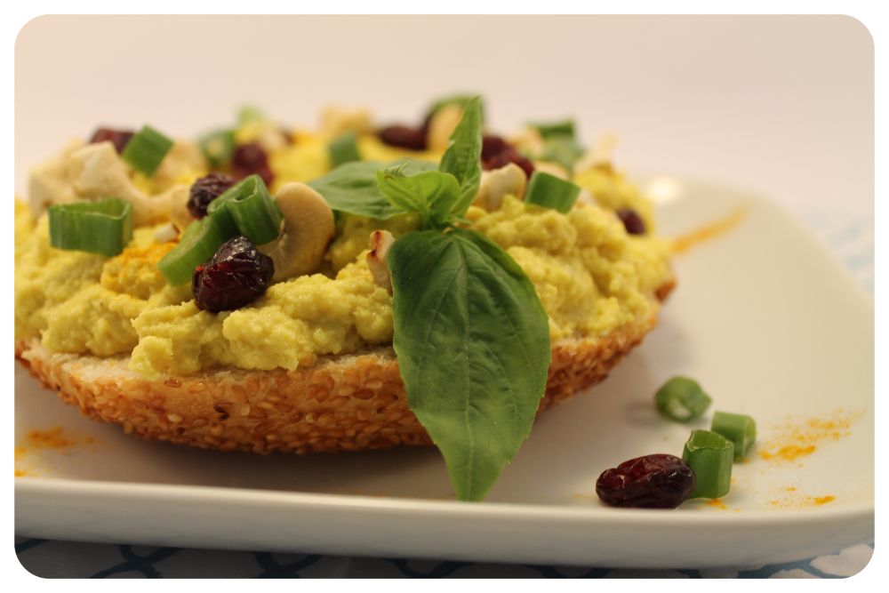 Den Sesamring mit dem Karfiol- Humus bestreichen und mit den Toppings dekorieren.