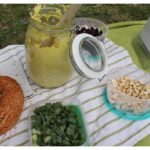 Währenddessen die Cashewkerne in einer Pfanne OHNE Öl goldbraun rösten und ebenfalls auskühlen lassen. Das Zwiebelgrün oder den Lauch in Ringe schneiden und beiseitestellen.