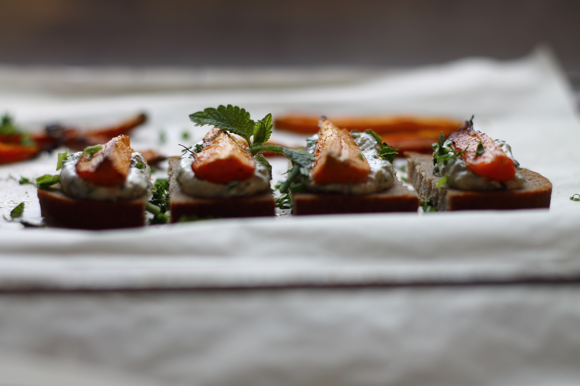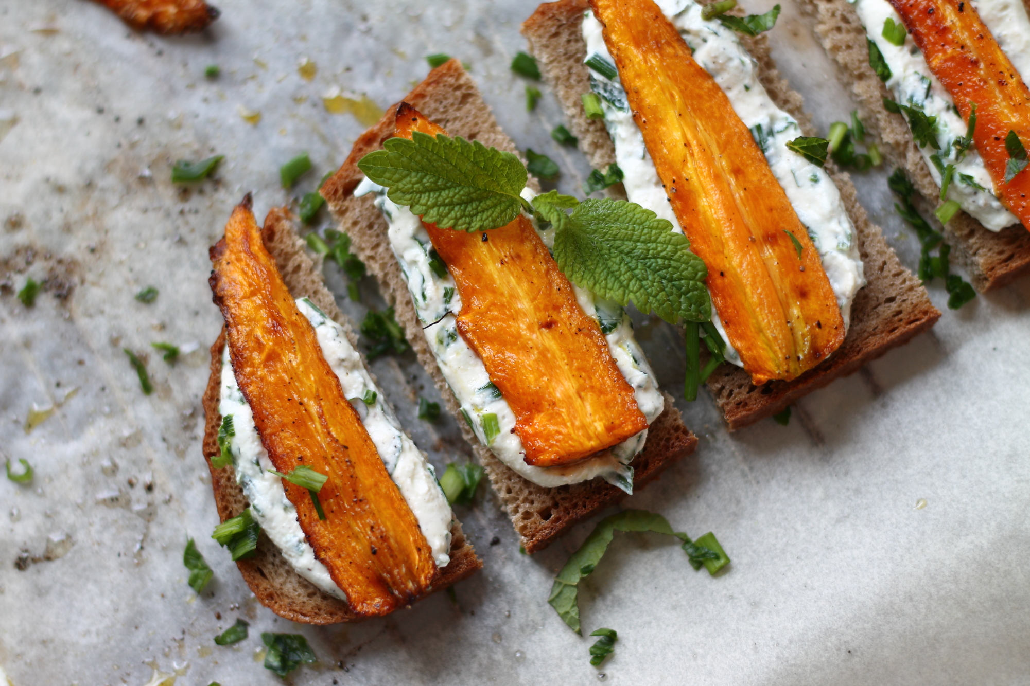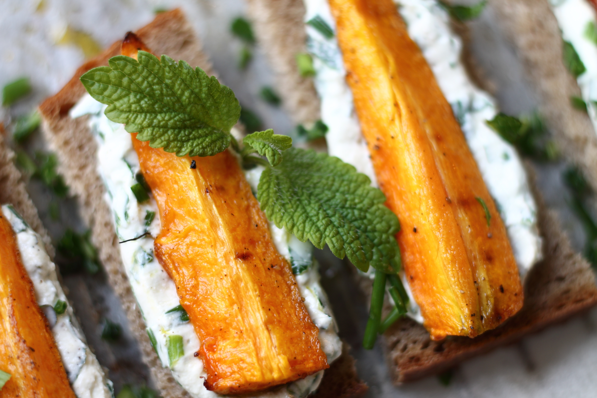 Die Brote mit dem Kräutertopfen bestreichen und die Karotten aus dem Ofen darauf platzieren.