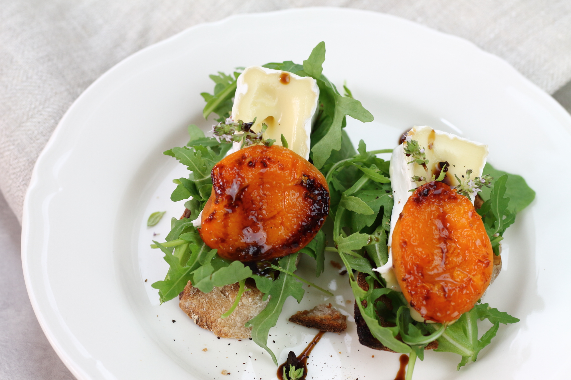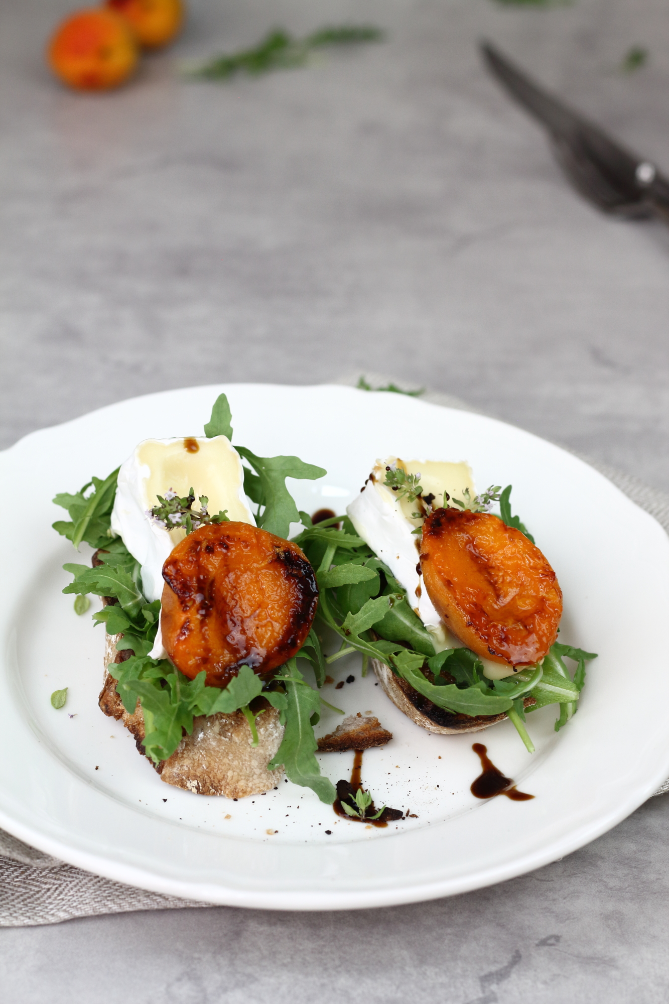 Die getoasteten Brotscheiben mit etwas Butter bestreichen, den Rucola darauf verteilen und den Camembert darauf setzen. Die Marillenhälften auf dem Käse platzieren und mit Balsamico Glace toppen.