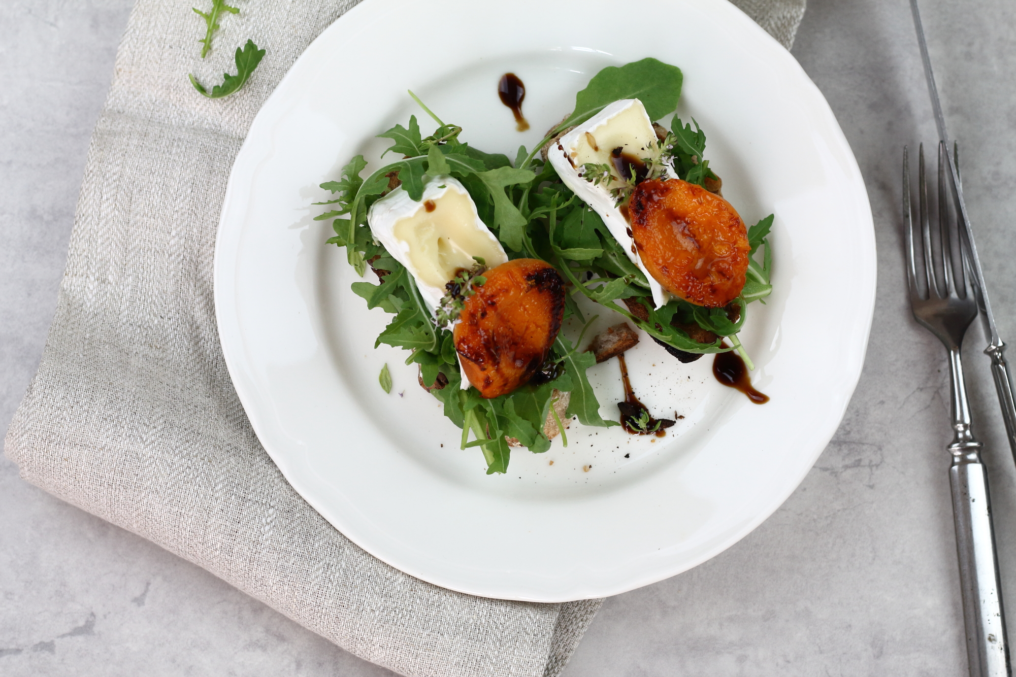Die getoasteten Brotscheiben mit etwas Butter bestreichen, den Rucola darauf verteilen und den Camembert darauf setzen. Die Marillenhälften auf dem Käse platzieren und mit Balsamico Glace toppen.