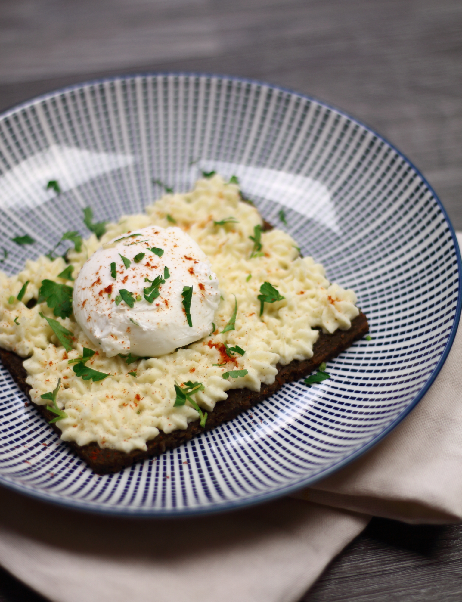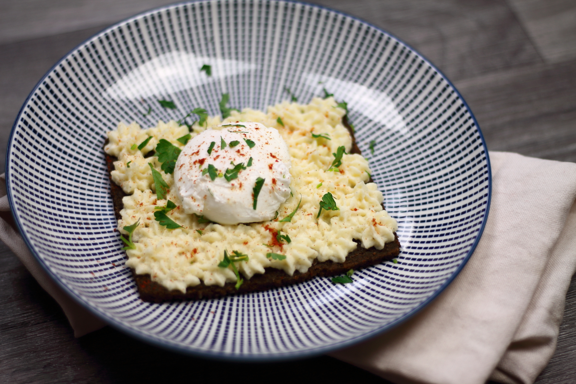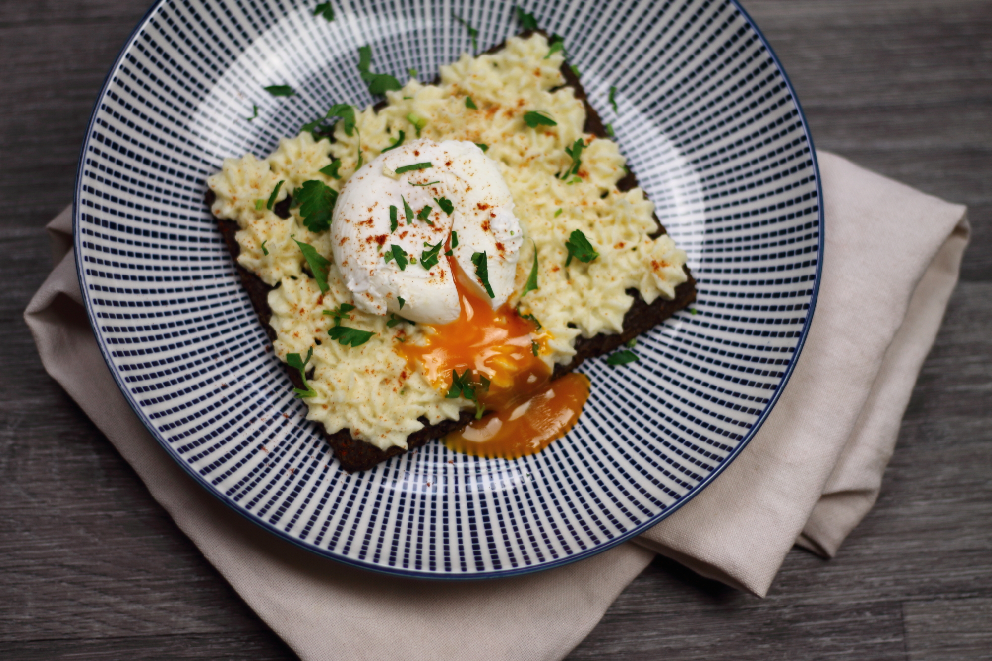 Den Pastinaken- Aufstrich am Pumpernickel verstreichen und das Ei darauf mittig platzieren. Mit Paprikapulver und gehackter Petersilie garnieren.