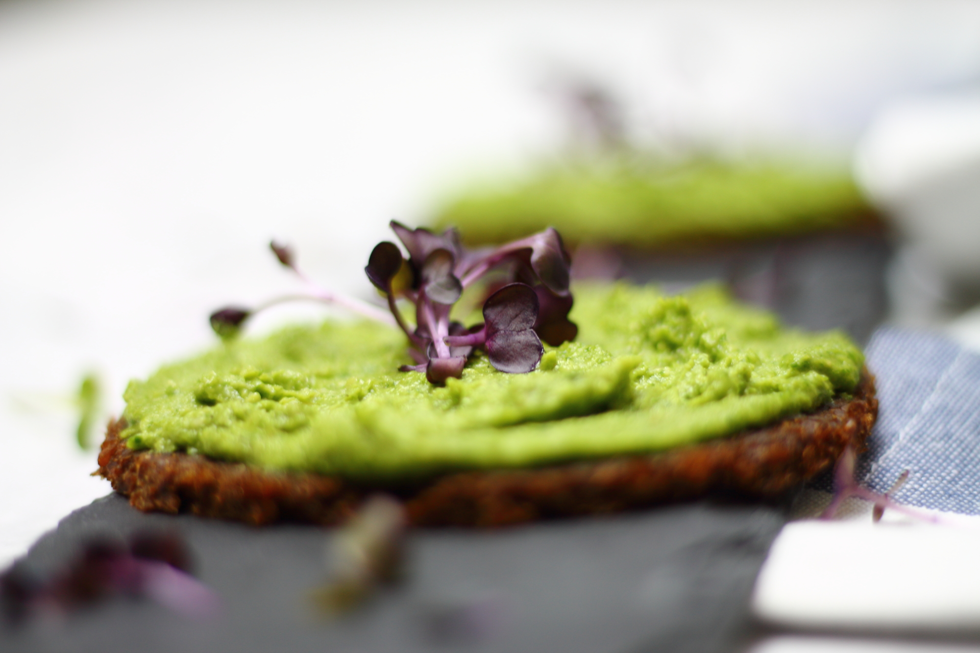 Den Pumpernickel toasten und mit dem Pesto, sowie den Sprossen toppen.