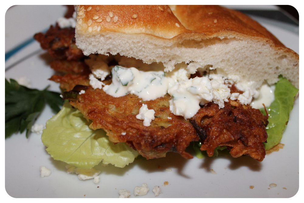 Knusprig, saftig, geschmackvoll und herzhaft. Heute gibt es ein ganz besonders leckeres Sandwich. Erdäpfel- Lauch- Puffer im Fladenbrot mit Feta- Käse und Dip. 🙂 Eines meiner Lieblingsrezepte.