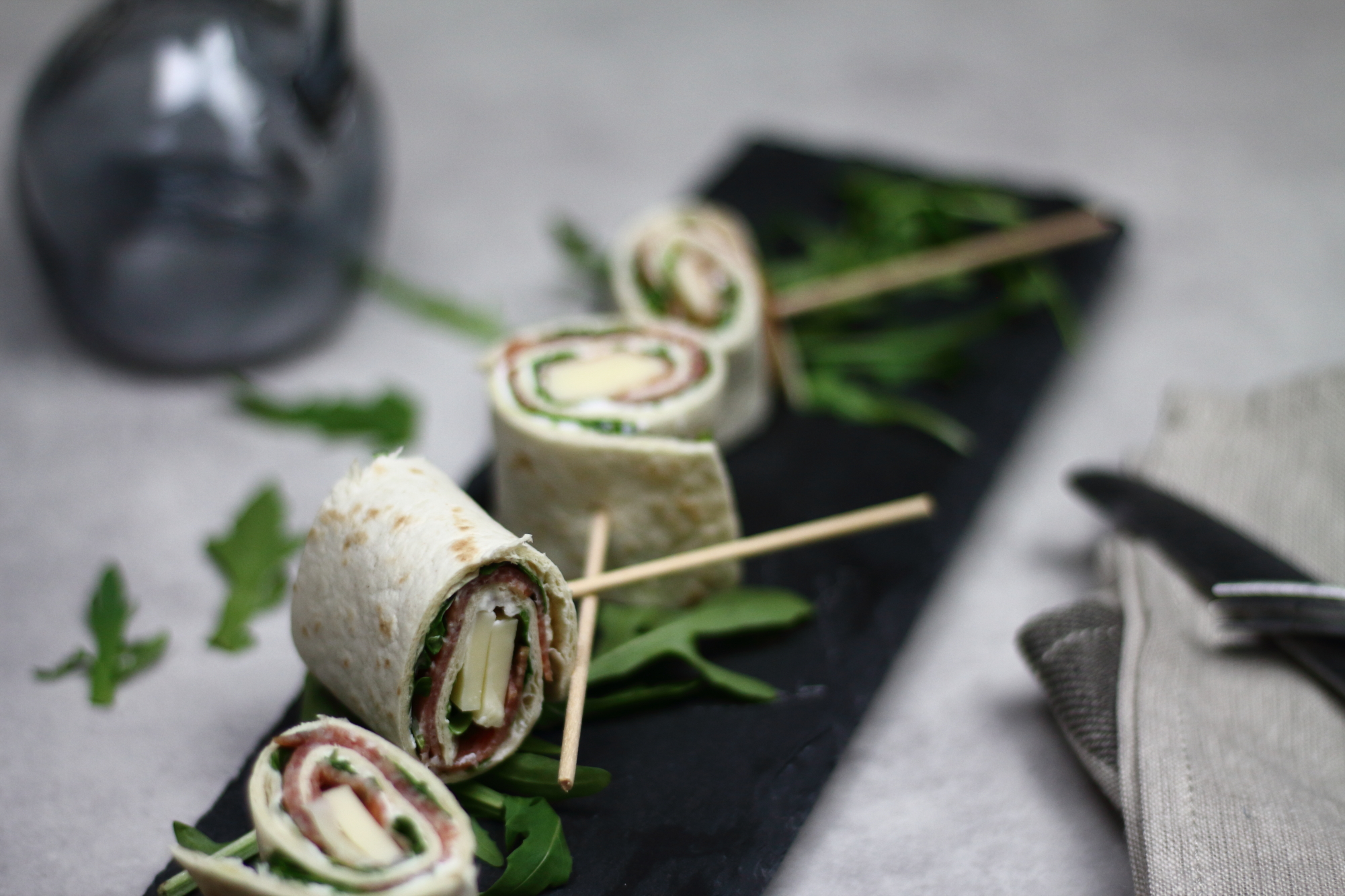 Anschließend mit dem Frischkäse bestreichen und mit etwas Salz und Pfeffer würzen. Den Rucola darauf verteilen und mit der Salami, sowie dem Käse belegen. Den Weizentortilla einrollen und in gleichmäßigen Abständen mit den Schaschlikspießen fixieren. Hierbei den Weizentortilla jedoch nicht durchstechen. Den gefüllten und fixierten Weizentortilla mithilfe eines scharfen Messers zwischen den Schaschlikspießen durchschneiden.