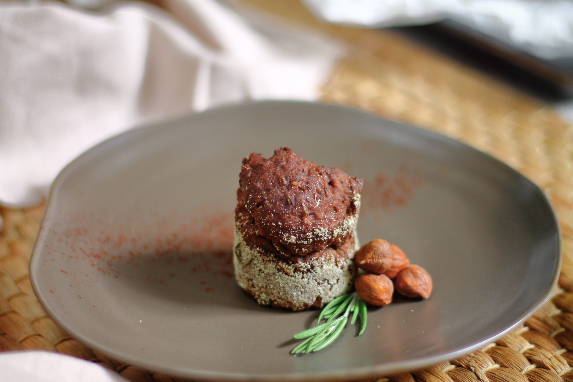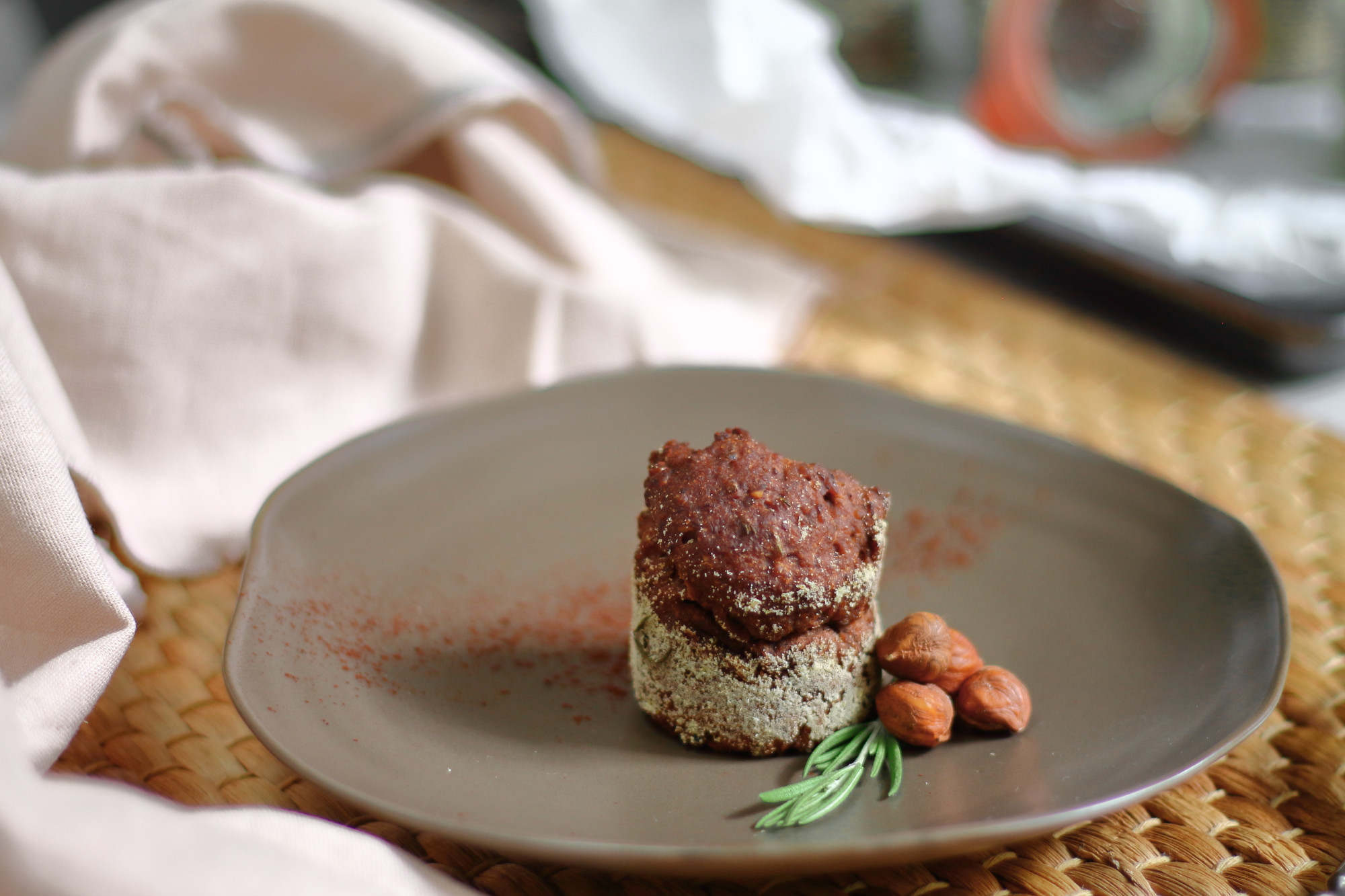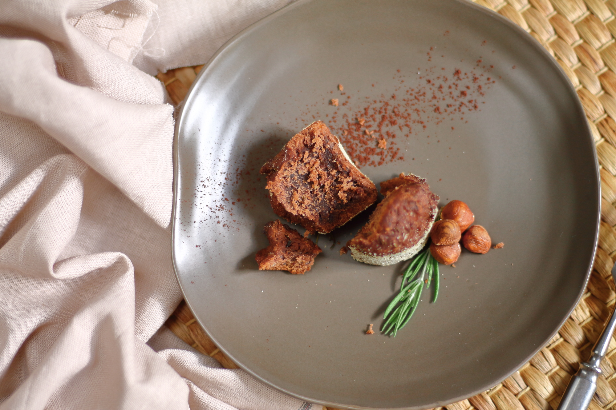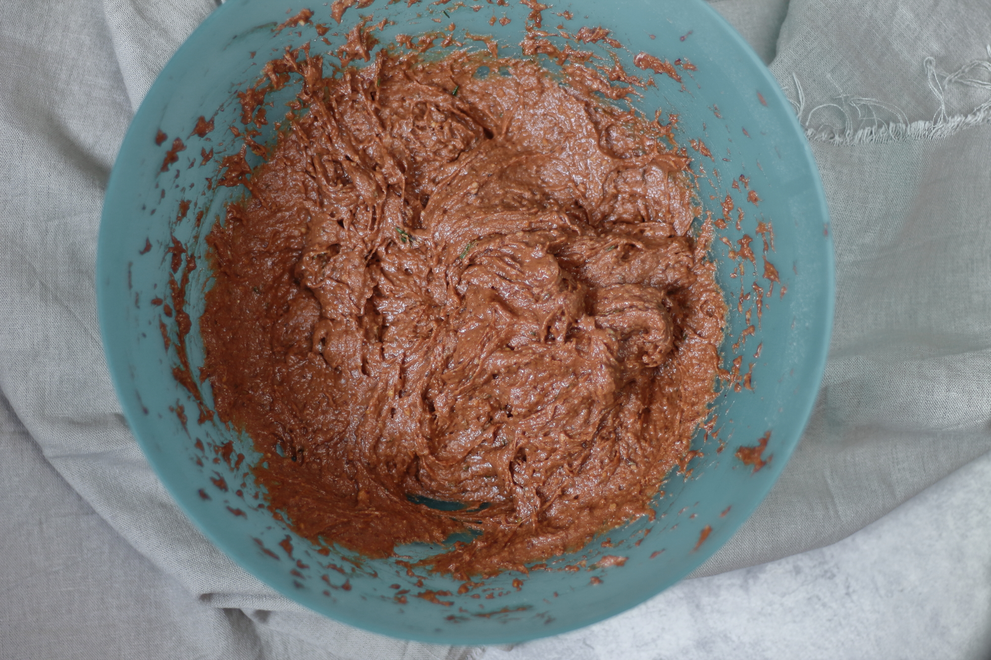 Nun die trockenen Zutaten (Mehl, Zucker, Rosmarin-Zucker, Zimt, Nüsse, Backpulver, Prise Salz und Kakaopulver) in einer Rührschüssel miteinander vermengen. Anschließend das Leinsamenei hinzugeben. Nach und nach abwechselnd die Pflanzenmilch und das Öl einrühren bis ein geschmeidiger Teig entsteht.