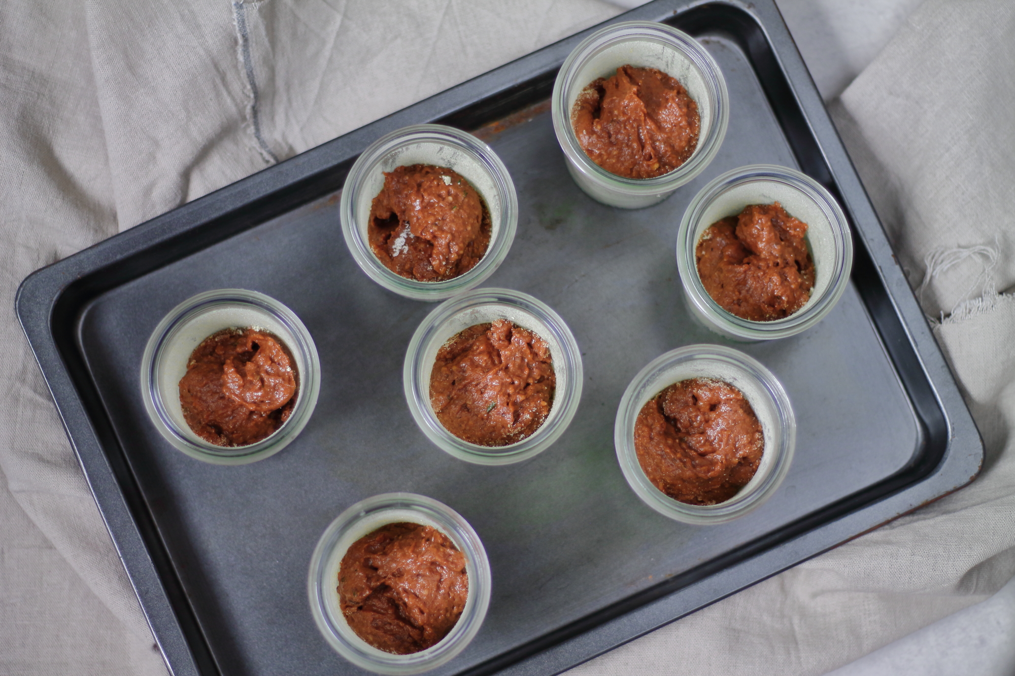 Die Gläser gut zu einem Drittel mit Teig befüllen und danach kontrollieren, dass die Ränder sauber geblieben sind bzw. die Ränder säubern. Bei 180°C Umluft rund 20 Minuten backen – Stäbchenprobe nicht vergessen.