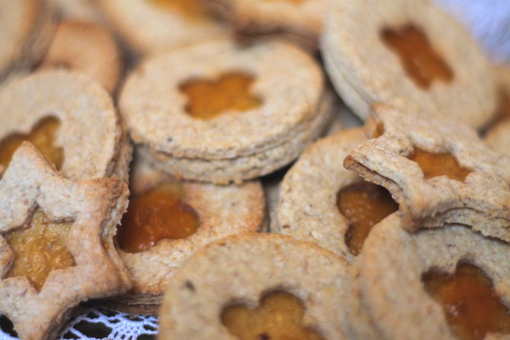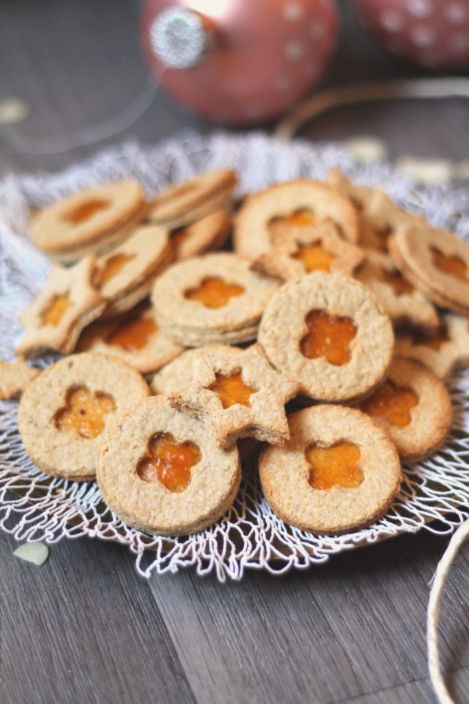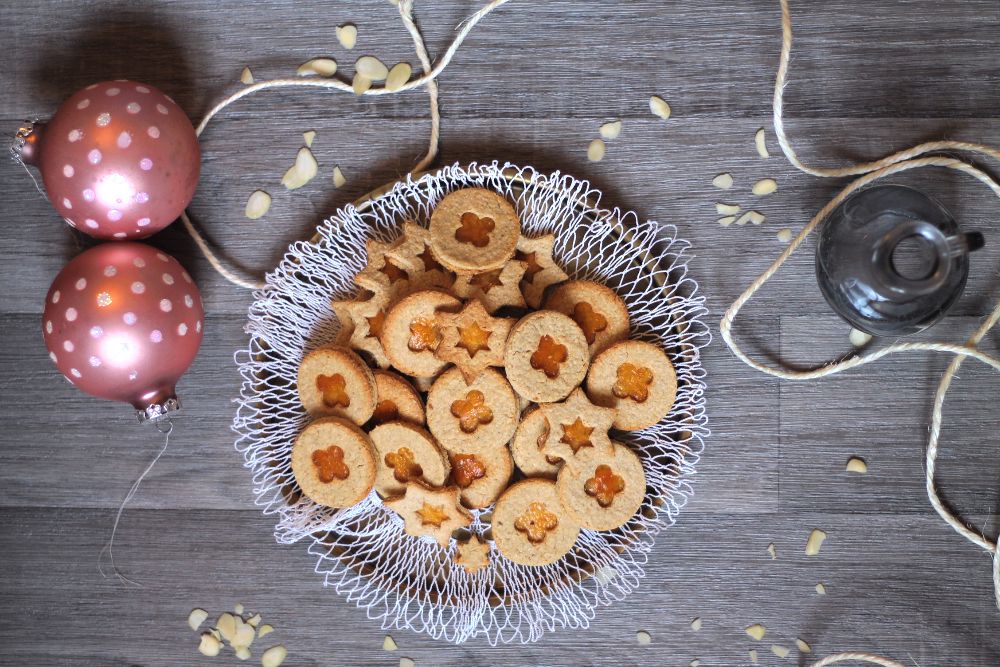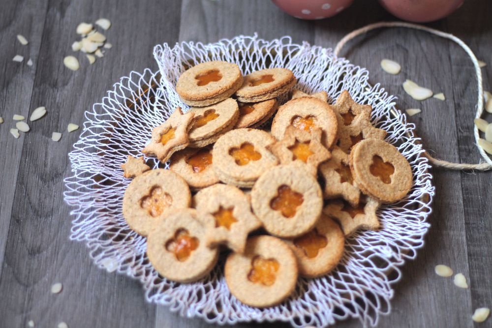 Wenn die Kekse kalt sind, etwas Marillenmarmelade erwärmen (diese gut durchrühren sodass keine Klümpchen mehr enthalten sind) und jeweils zwei Kekse damit „zusammenkleben“.