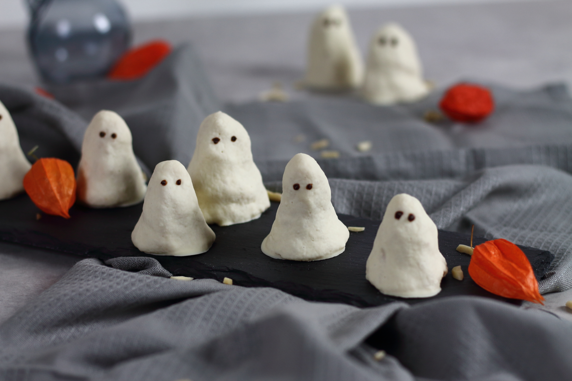 Das Kokosnussmus war hart – es war einfach steinhart. Was soll ich nun mit hartem Kokosmus machen? Ich habe das Glas genommen, in der Mikro erwärmt und es wurde wieder flüssig. Gestern musste ich wieder an das Ganze denken und mir kam die Idee Kokos- Geister mit weißer Schokolade für Halloween auszuprobieren. Wie du auf den Fotos sehen kannst, hat es funktioniert und die Geister sehen einfach richtig knuffig aus (und gar nicht so wirklich gruselig). 🙂 Ich muss ja zugeben, ich mag Halloween und verkleide mich mittlerweile auch richtig gerne, aber heuer werde ich Halloween einmal aus beruflichen Gründen auslassen. Also ich meine, die Party werde ich auslassen – die gruseligen Snacks gibt es trotzdem. Ich habe schon so viele tolle Halloween- Ideen auf den verschiedensten Social Media Kanälen gesehen, dass ich am liebsten gleich alles ausprobieren möchte. Aber wie mein Freund immer sagt: „Wer soll denn das alles essen?“ – Naja, irgendwer hat es bis jetzt ja immer verputzt.  😀