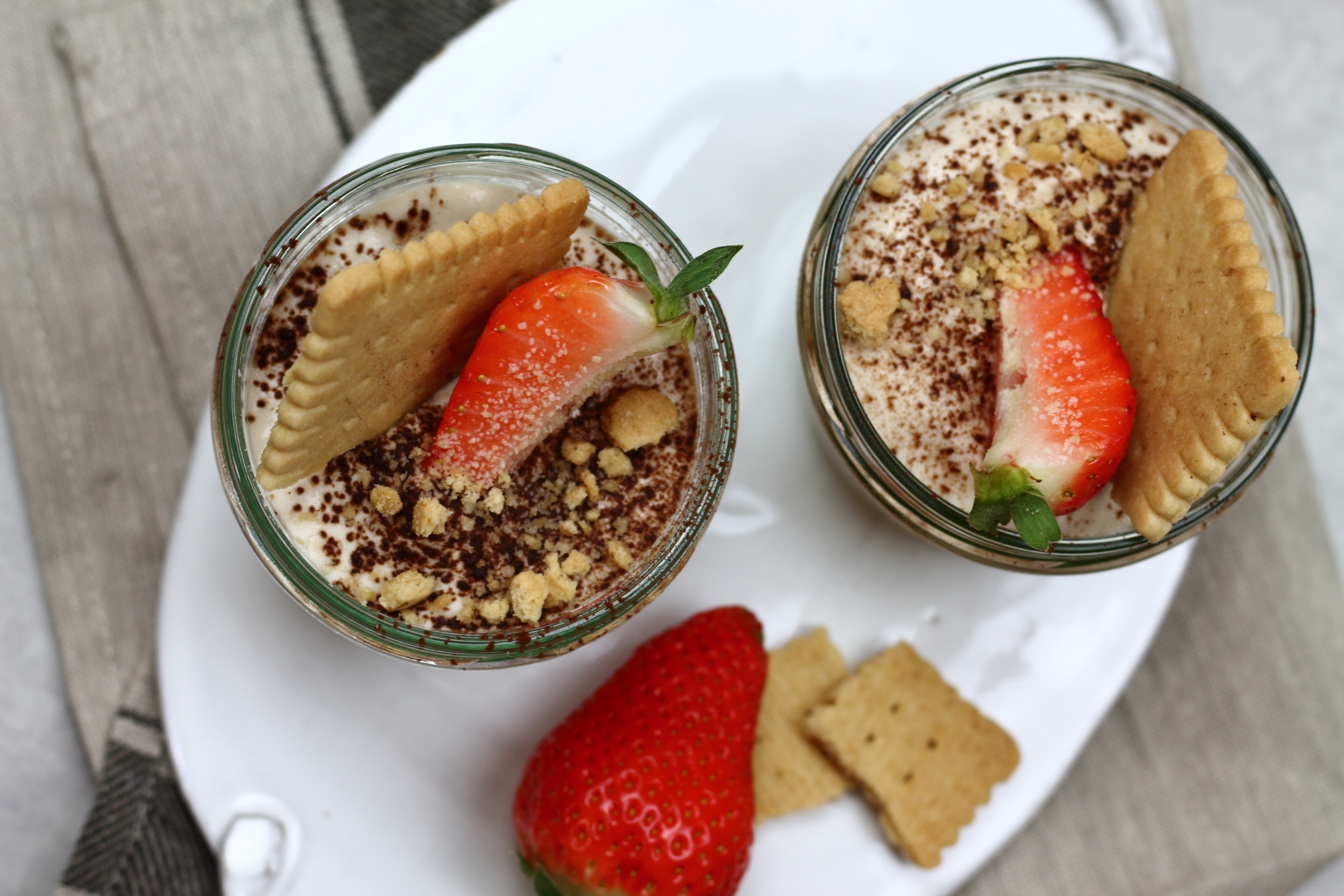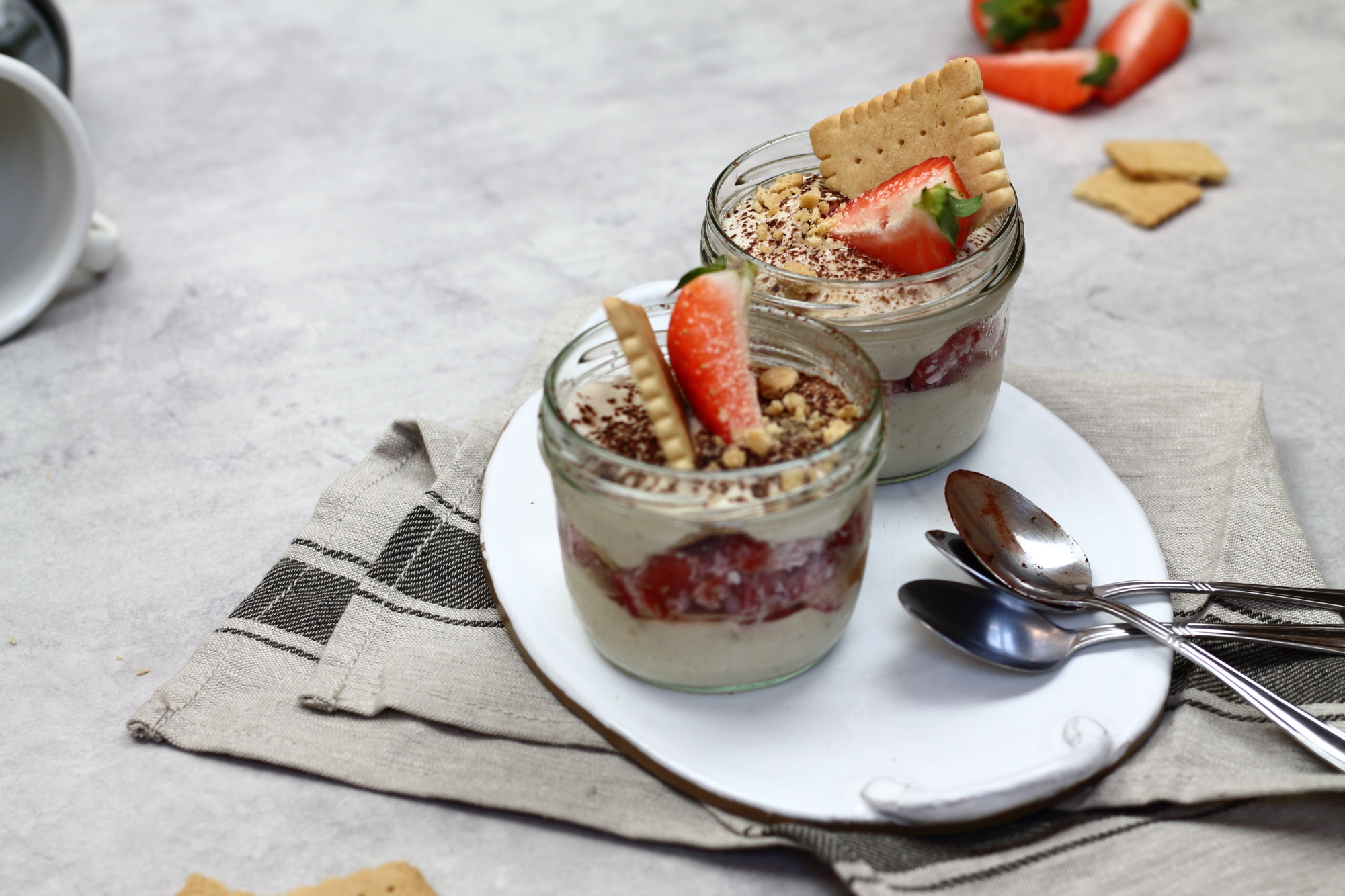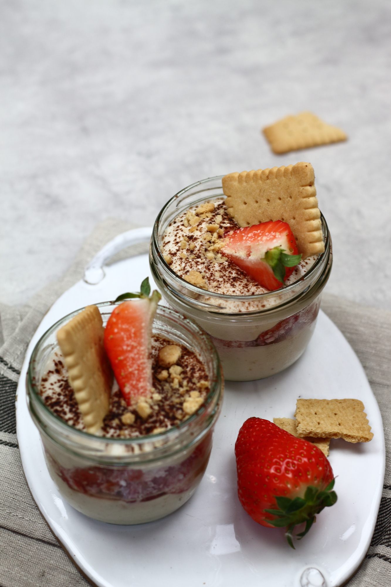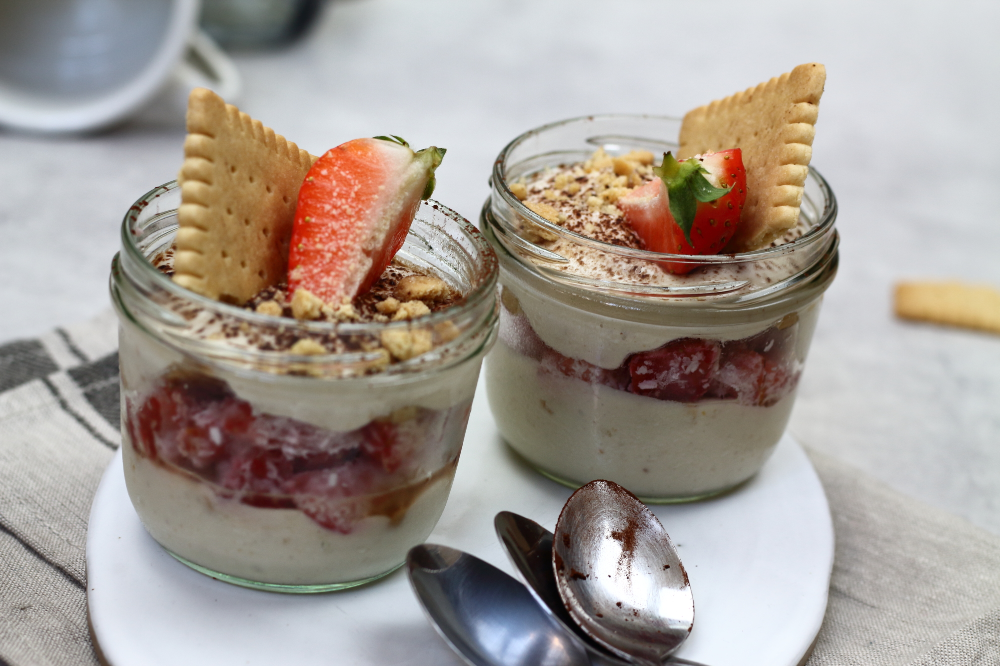 Nun wird alles in den Gläsern geschichtet. Zuerst kommt eine Schicht Creme in die Gläser. Anschließend die Kekse kurz in den Tee tunken und auf die Creme legen. Die Erdbeeren auf den Keksen verteilen und diese wiederum mit getränkten Keksen toppen. Zum Schluss mit einer Schicht Creme abschließen. Für mind. 2 Stunden kalt stellen. Mit etwas zerbröselten Keksen, Backkakao und frischen Erdbeeren garnieren.
