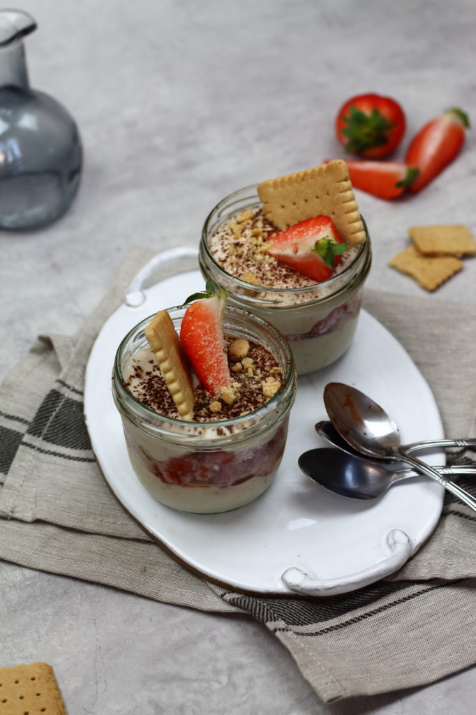 Nun wird alles in den Gläsern geschichtet. Zuerst kommt eine Schicht Creme in die Gläser. Anschließend die Kekse kurz in den Tee tunken und auf die Creme legen. Die Erdbeeren auf den Keksen verteilen und diese wiederum mit getränkten Keksen toppen. Zum Schluss mit einer Schicht Creme abschließen. Für mind. 2 Stunden kalt stellen. Mit etwas zerbröselten Keksen, Backkakao und frischen Erdbeeren garnieren.