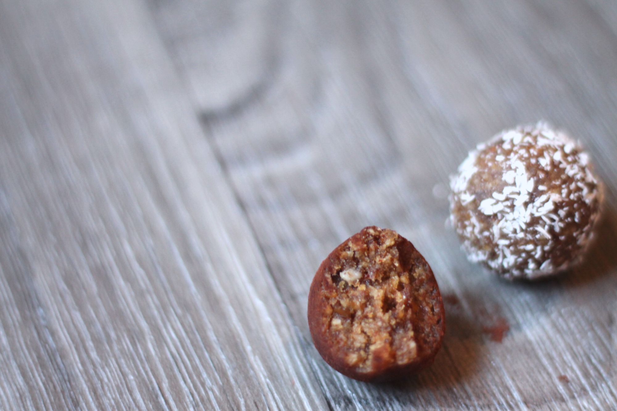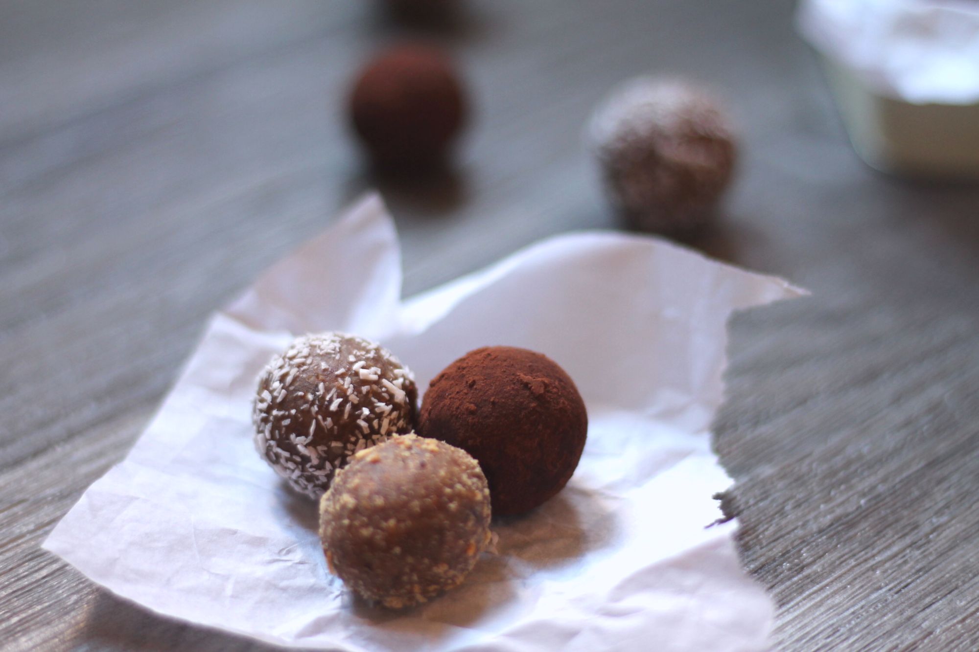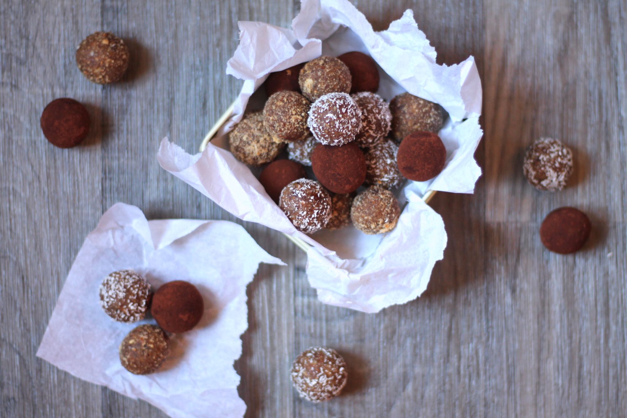 Daraus nun 25 gleich große Kugeln/Kugerl formen und in Kokosraspeln, gemahlenen Nüssen oder Kakaopulver (Backkakao) wälzen.