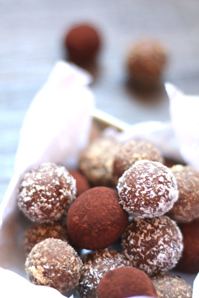 Daraus nun 25 gleich große Kugeln/Kugerl formen und in Kokosraspeln, gemahlenen Nüssen oder Kakaopulver (Backkakao) wälzen.
